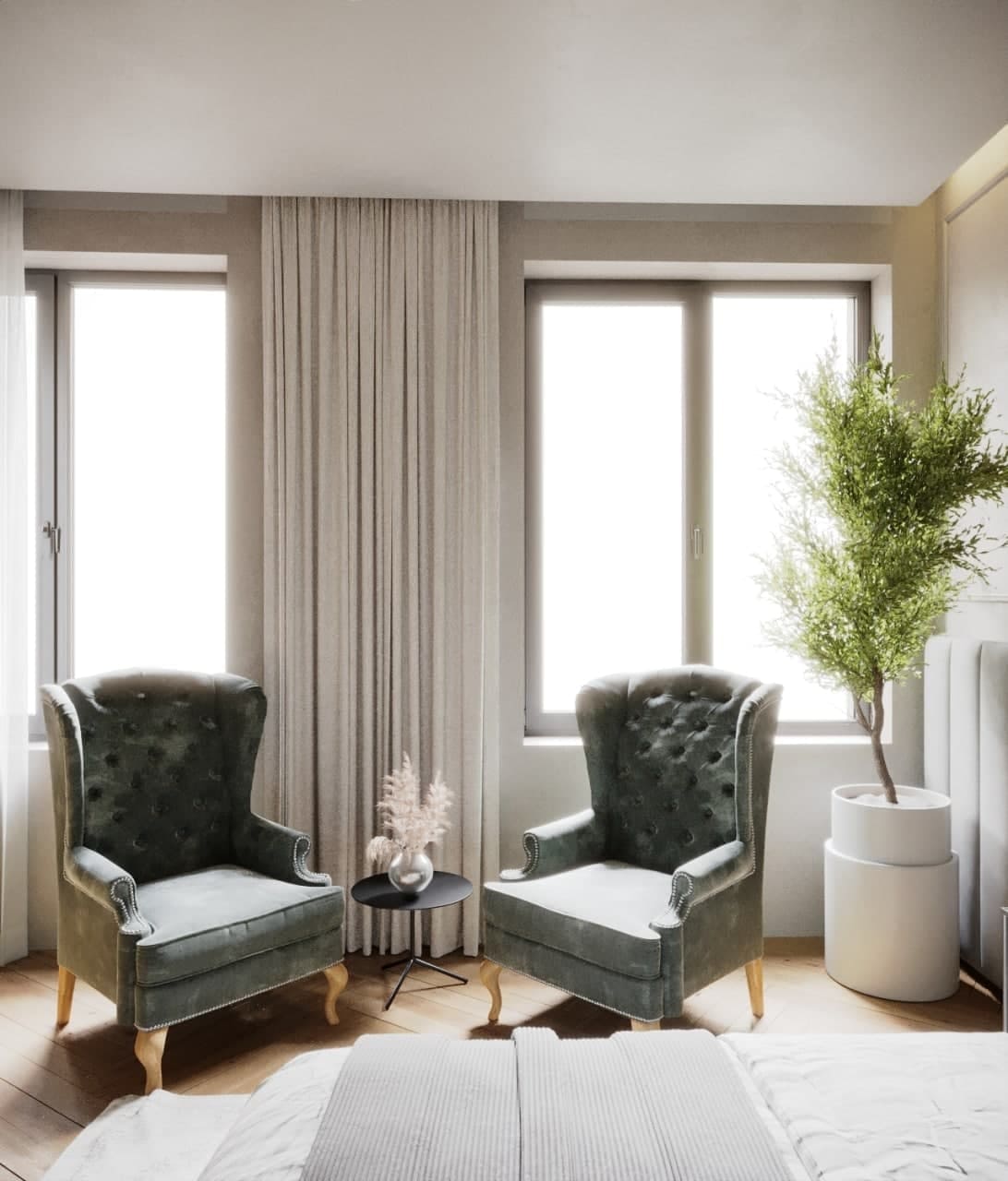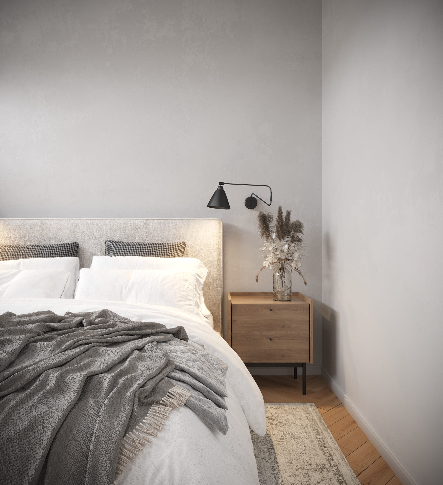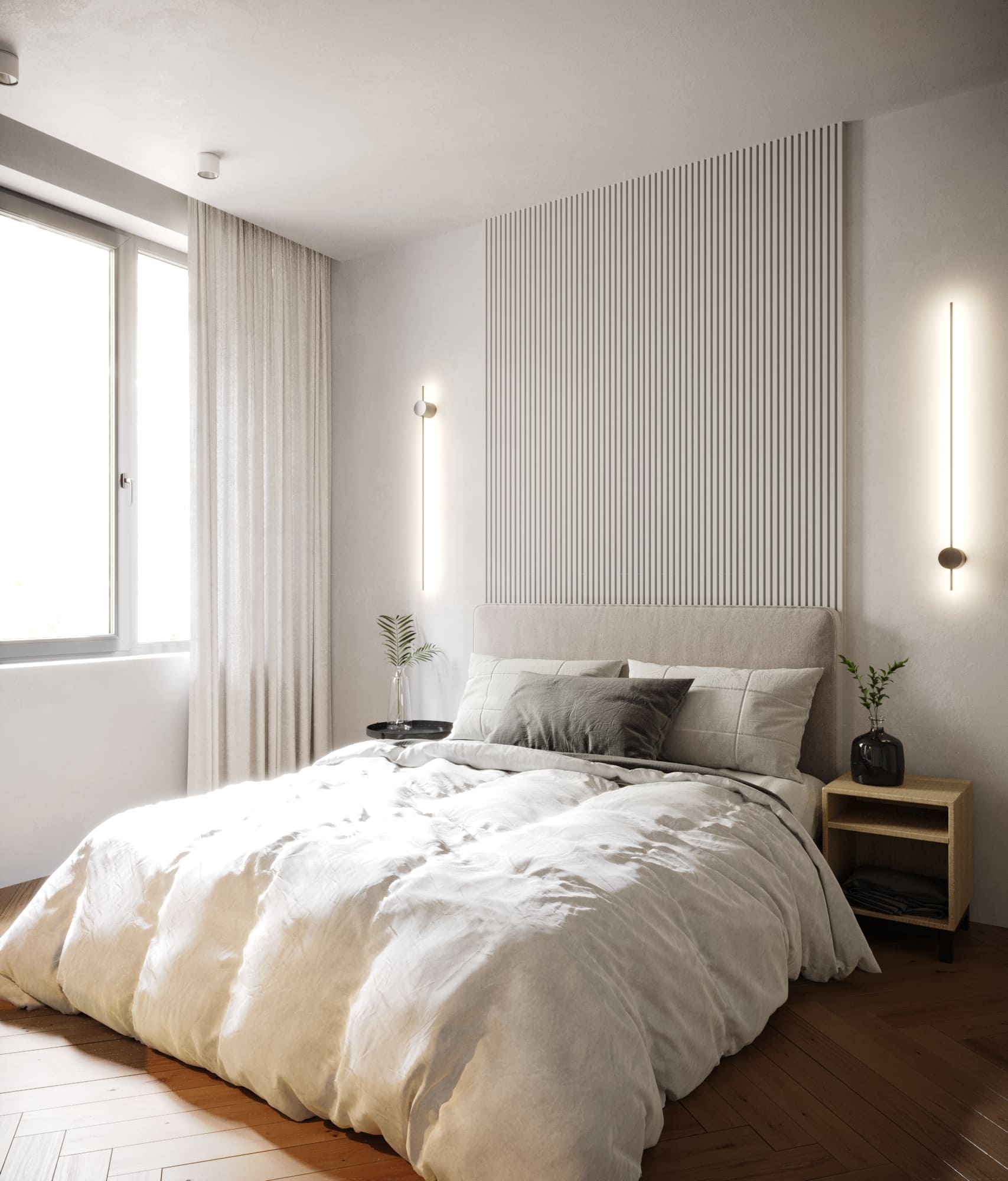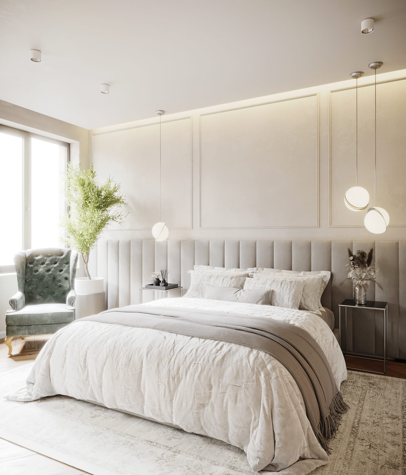Первая из трех спален в квартире. Выполнена в классическом стиле, большая кровать с мягким изголовьем, элегантные подвесы. Это создает атмосферу релакса в объединении с классической грацией. Также в комнате есть зоны для чтения, небольшая рабочая зона и, конечно, собственный санузел.