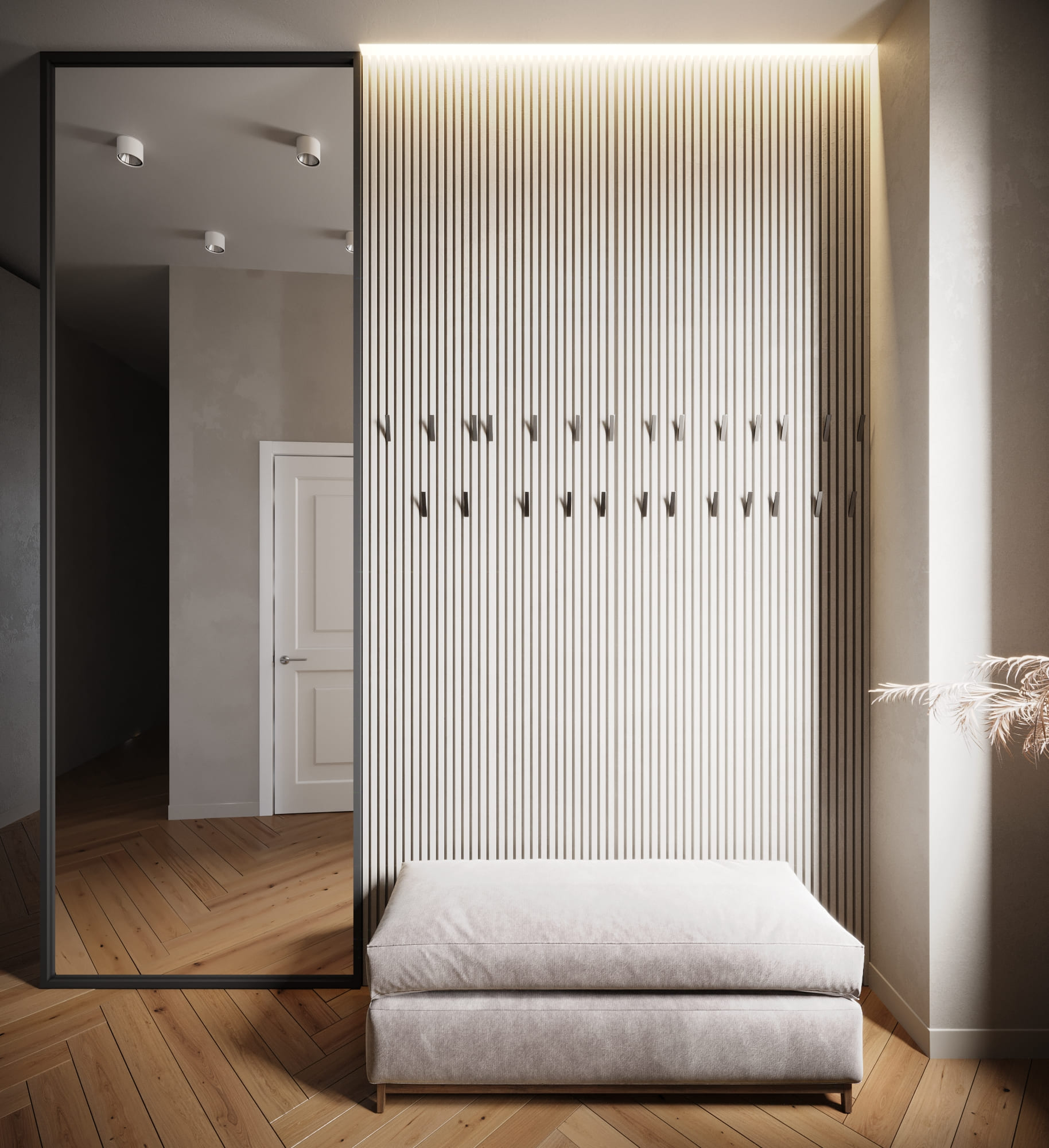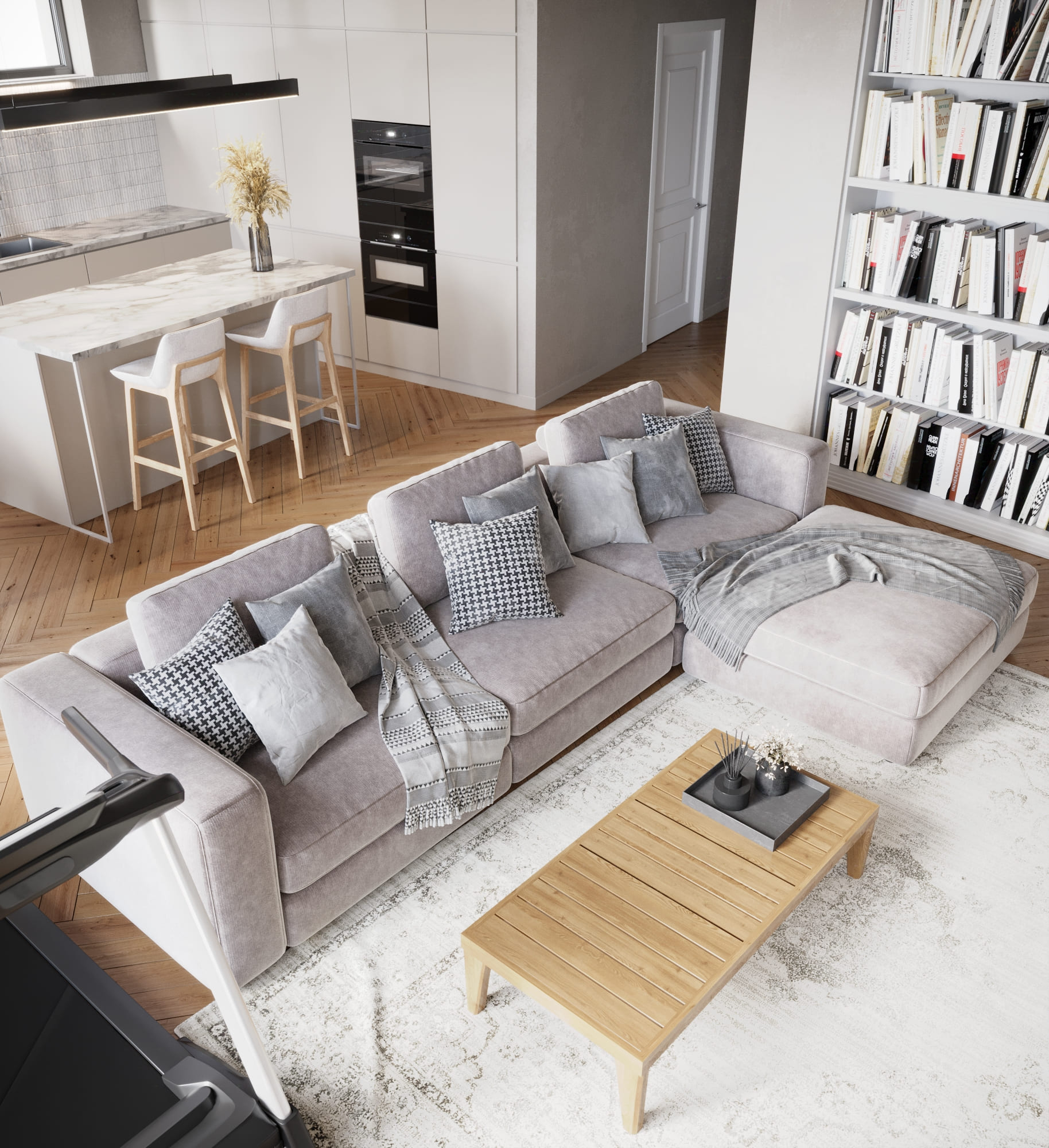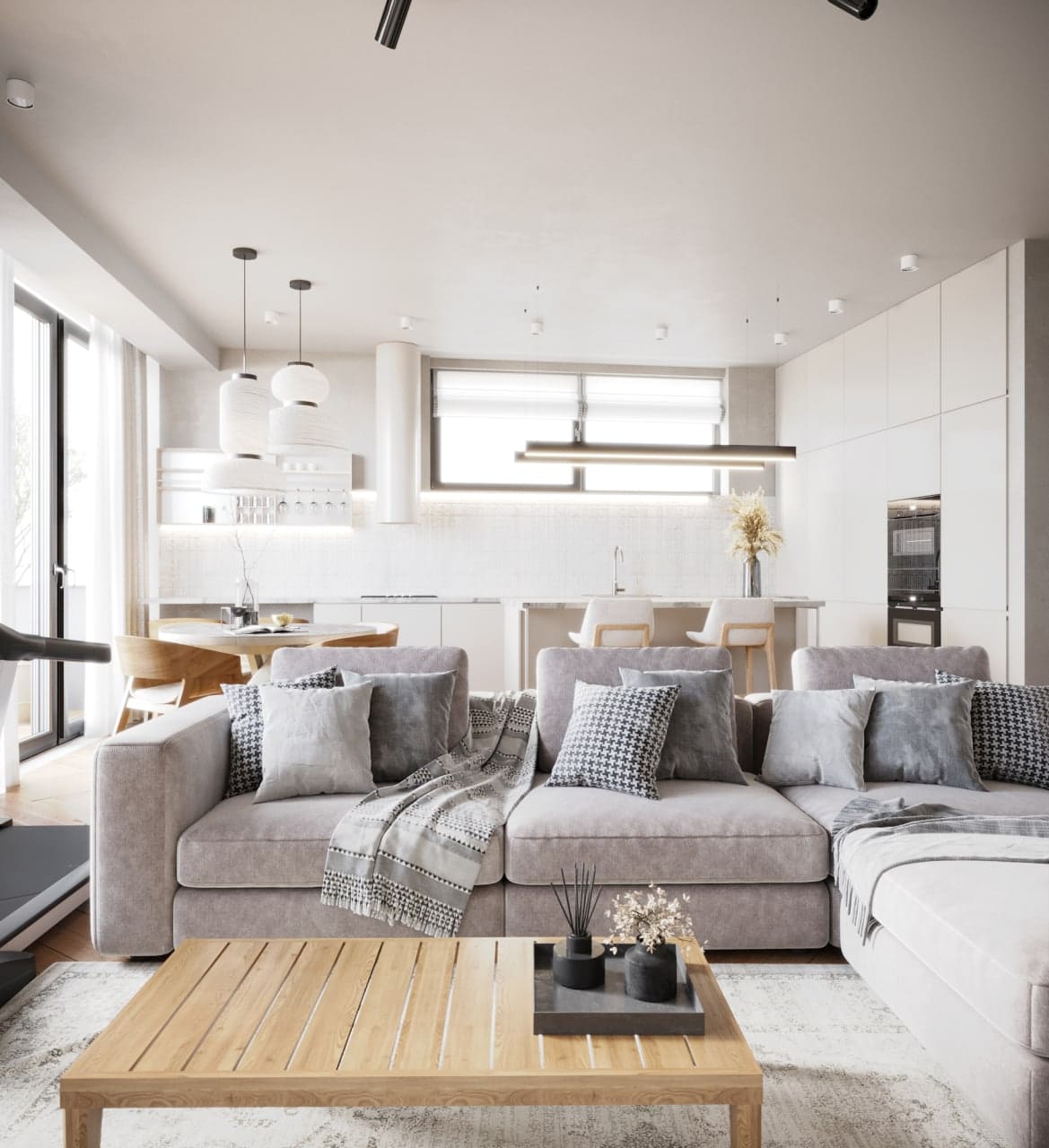 Квартира пропитана светом и уютом, цветовая гамма –– тепло-серая, акценты на черных линиях.