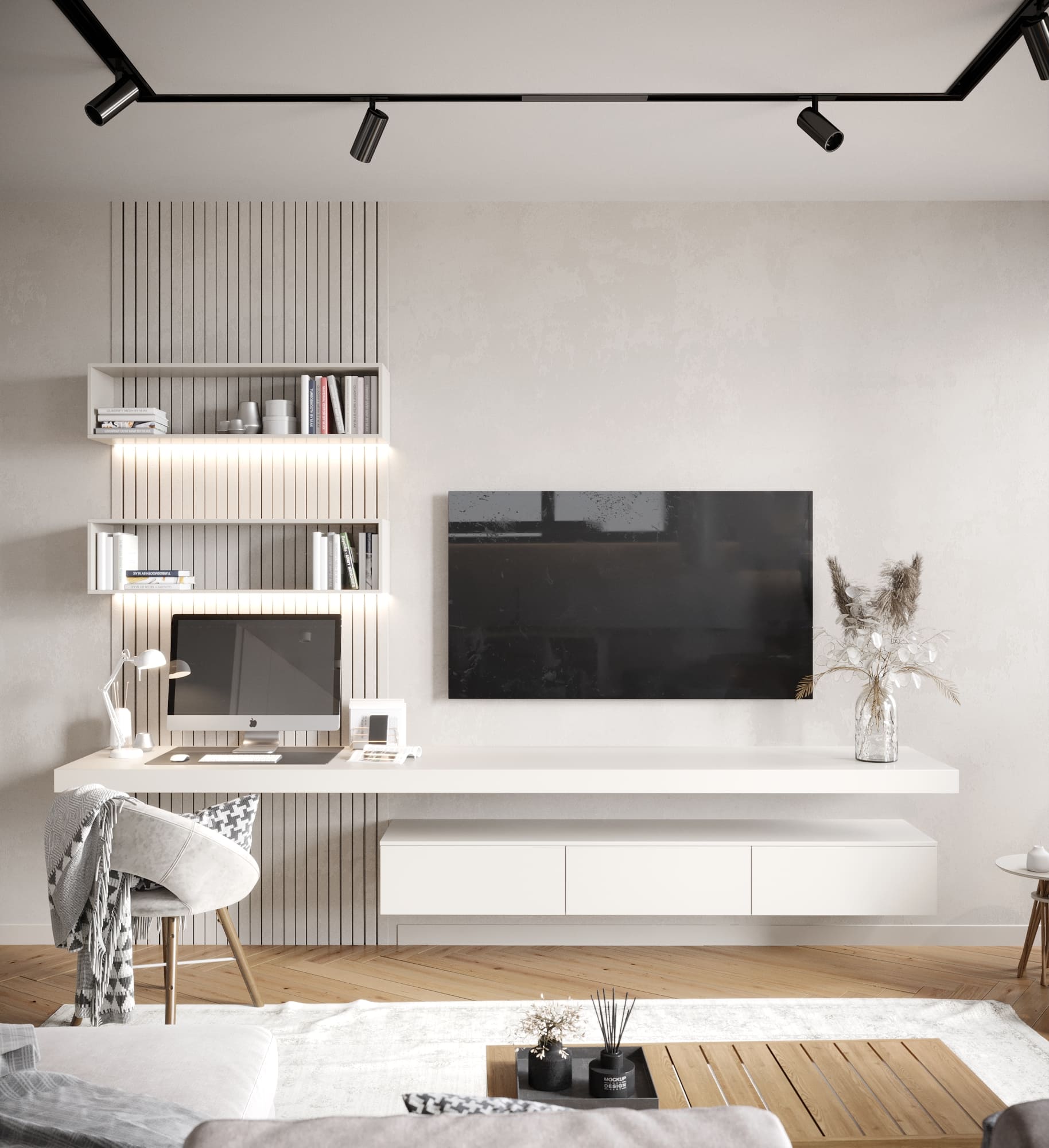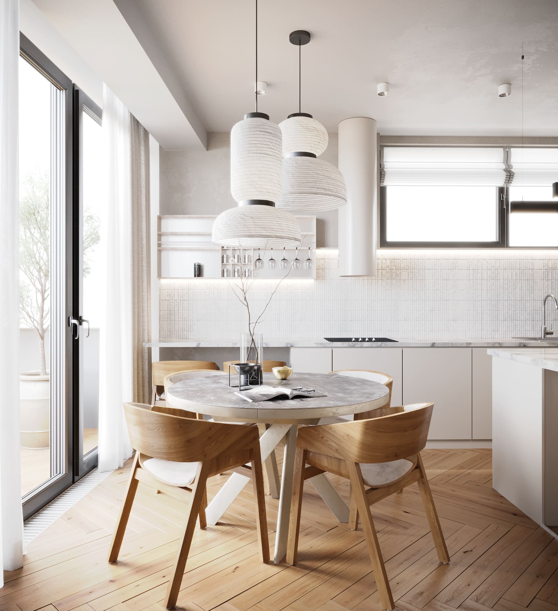 Являясь последовательными в воплощении минимализма, мы отказались от верхних шкафчиков, оставив только боковые панели с оборудованием. Для дополнительного пространства создано островок, чтобы позаботиться про быстрый и приятный завтрак. Заказчикам было важно разместить круглый стол, чтобы собраться всей семьей. Что же, выполнено! Кроме этого, стол раздвижной. Теперь семья может собираться на обед вместе, еще и наблюдая на украшенную цветами террасу и реку. Атмосферу уюта добавляет еще и сочетание белого цвета с деревом, а также капля черных элементов.