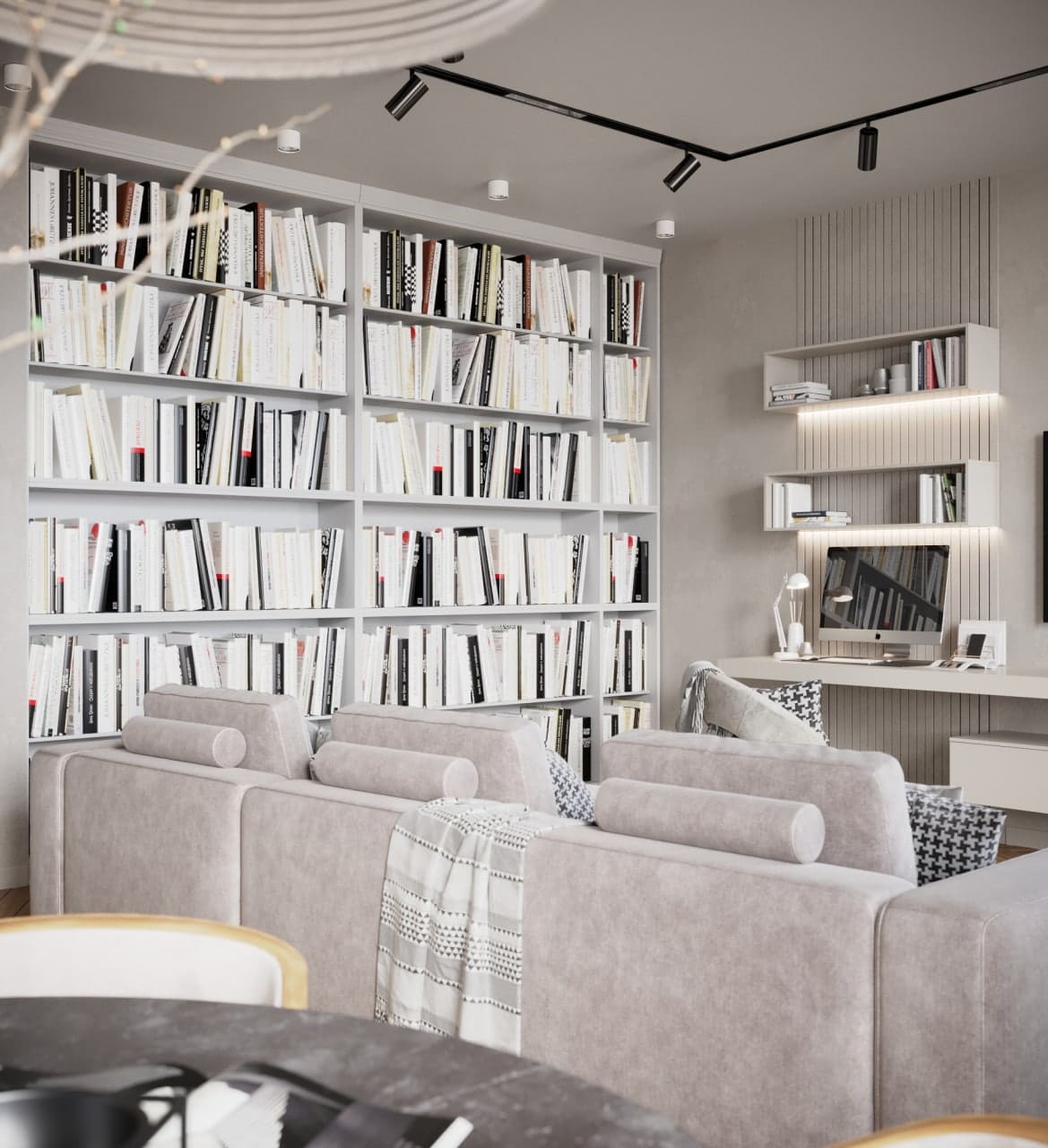 В гостиной мы разместили большой угловой диван для сохранения пространства и стеллаж для книг. Последнее было обязательным, так как заказчики те ещё книголюбы. И мы позаботились про функциональное и эстетичное решение. Также мы реконструировали и вписали в интерьер уже имеющуюся антикварную мебель, объединив современность и дорогие сердцу вещи.