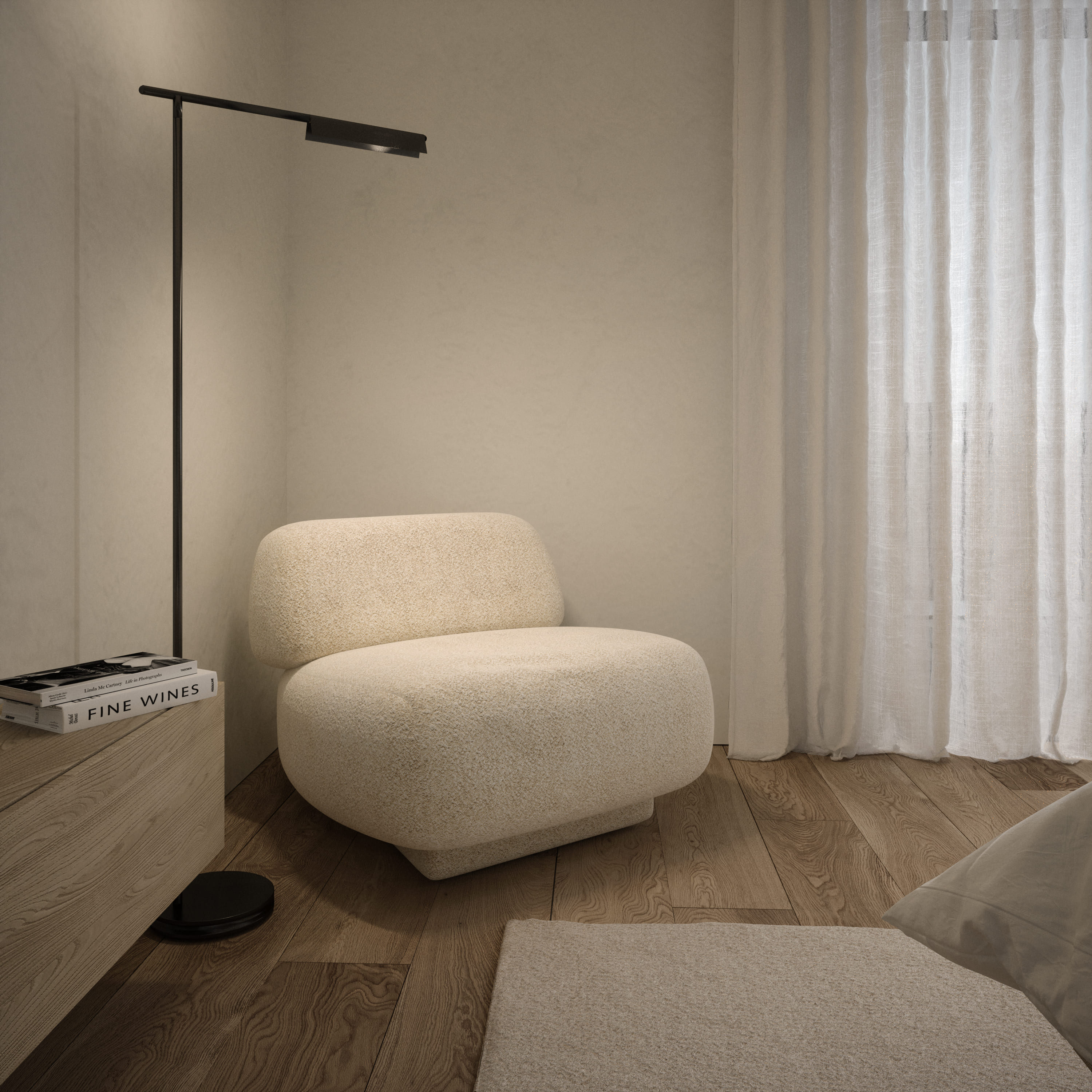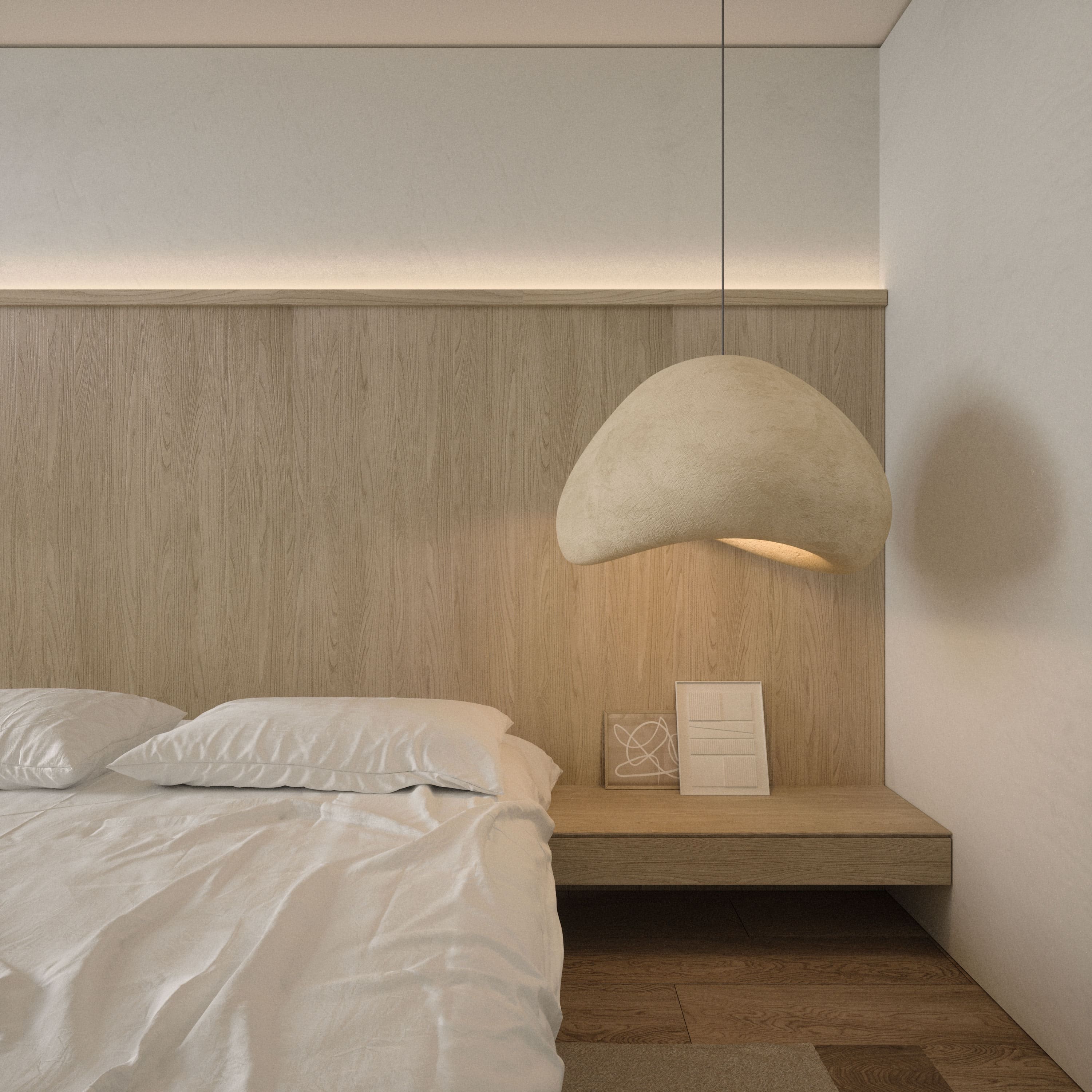 Спальня изображена большой подвесной кроватью и создает асимметрию композиции благодаря прикроватным тумбам. Необычная прикроватная тумба с мраморным основанием и светильником-полумесяцем с одной стороны, а с другой –– легкий будто облачко подвесной светильник украинского производителя.