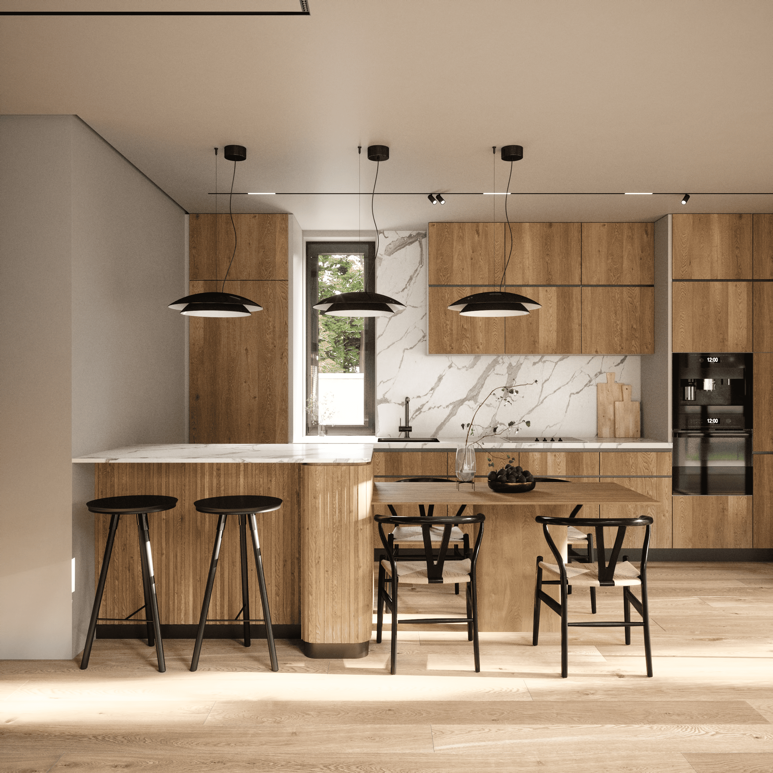 Светлая просторная кухня, которая продолжает идею для приближения к природе. Выполнения в минимализме, вона наполнена деревом, в частности, фасадами, и хорошо осветлена. Кухонные рабочие поверхности, а также фартук выполнены из белого мрамора. Акцента придают тонкие черные элементы и встроенные трековые светильники.