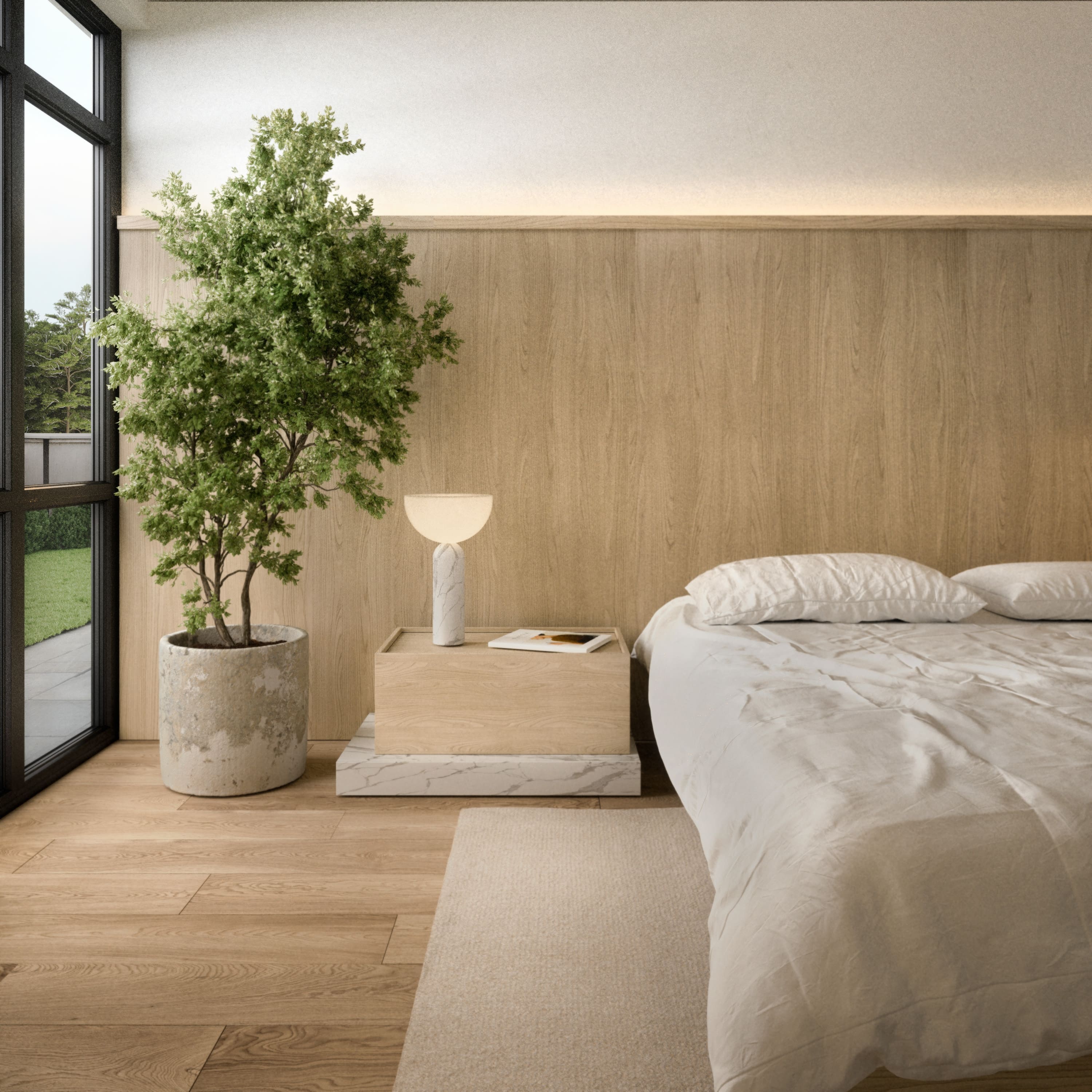 Интерьер, который говорит про самодостаточность и индивидуальность. Поскольку заказчица любит натуральные материалы, мы объединили теплоту дерева и строгость прямых линий, а также сохранили природное осветление комнат. Также мы побеспокоились про максимальное объединение с природой, разместив в углу комнаты дерева.