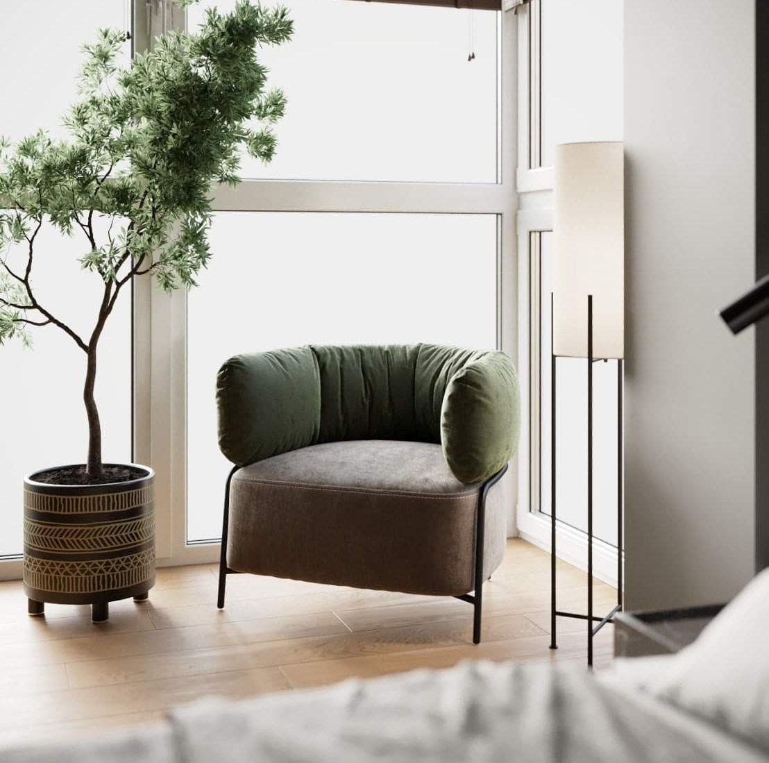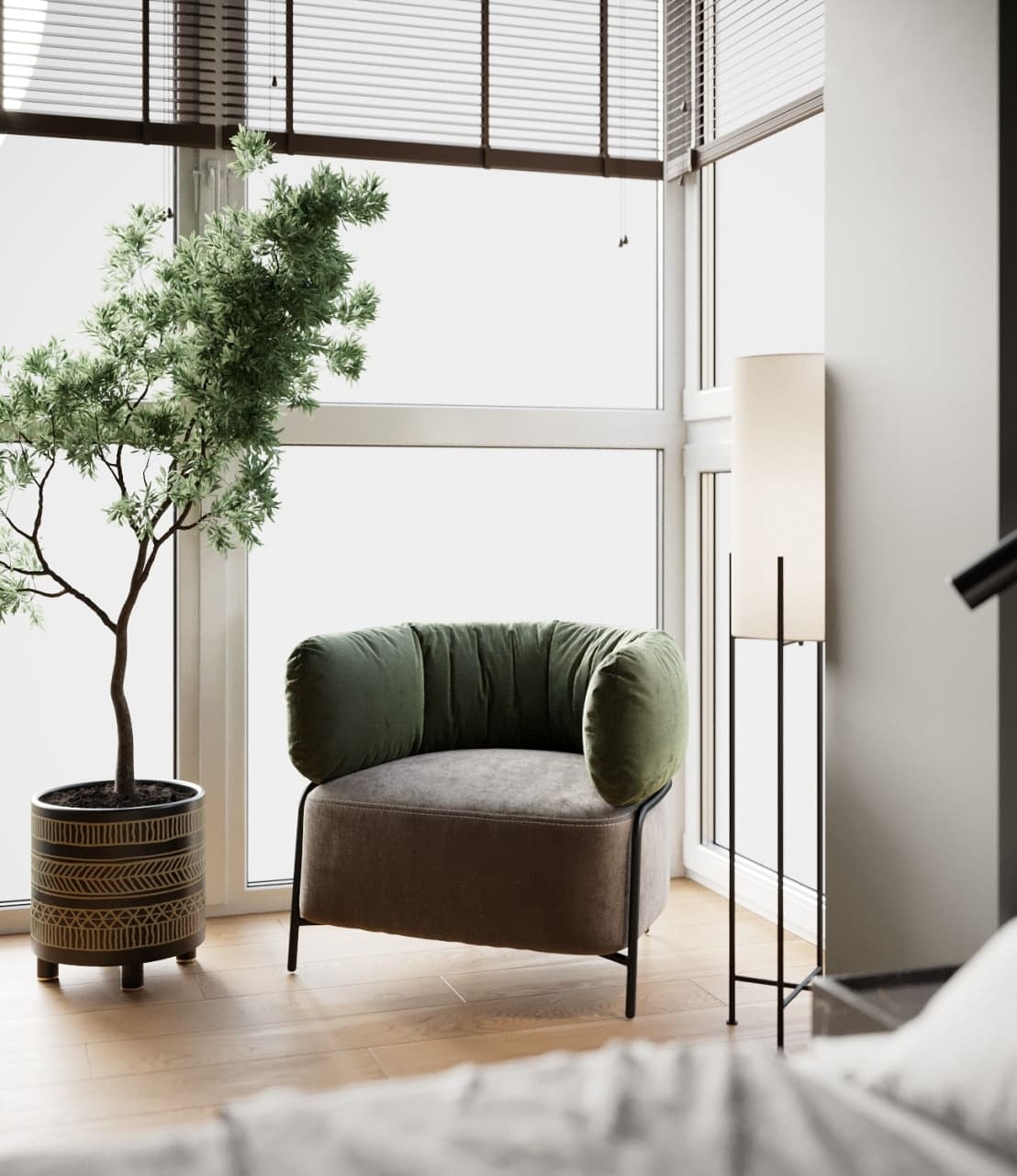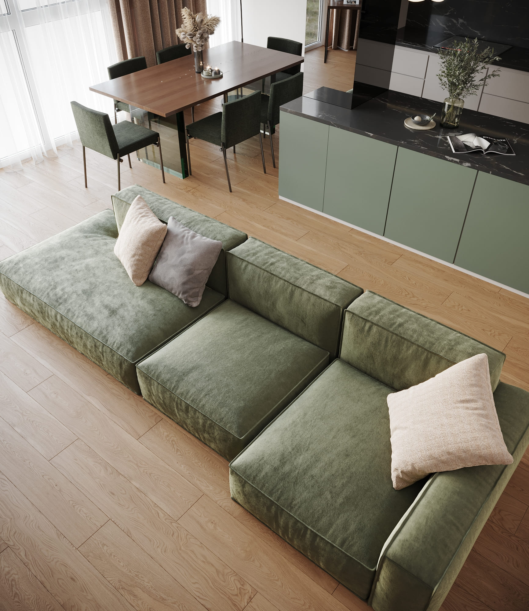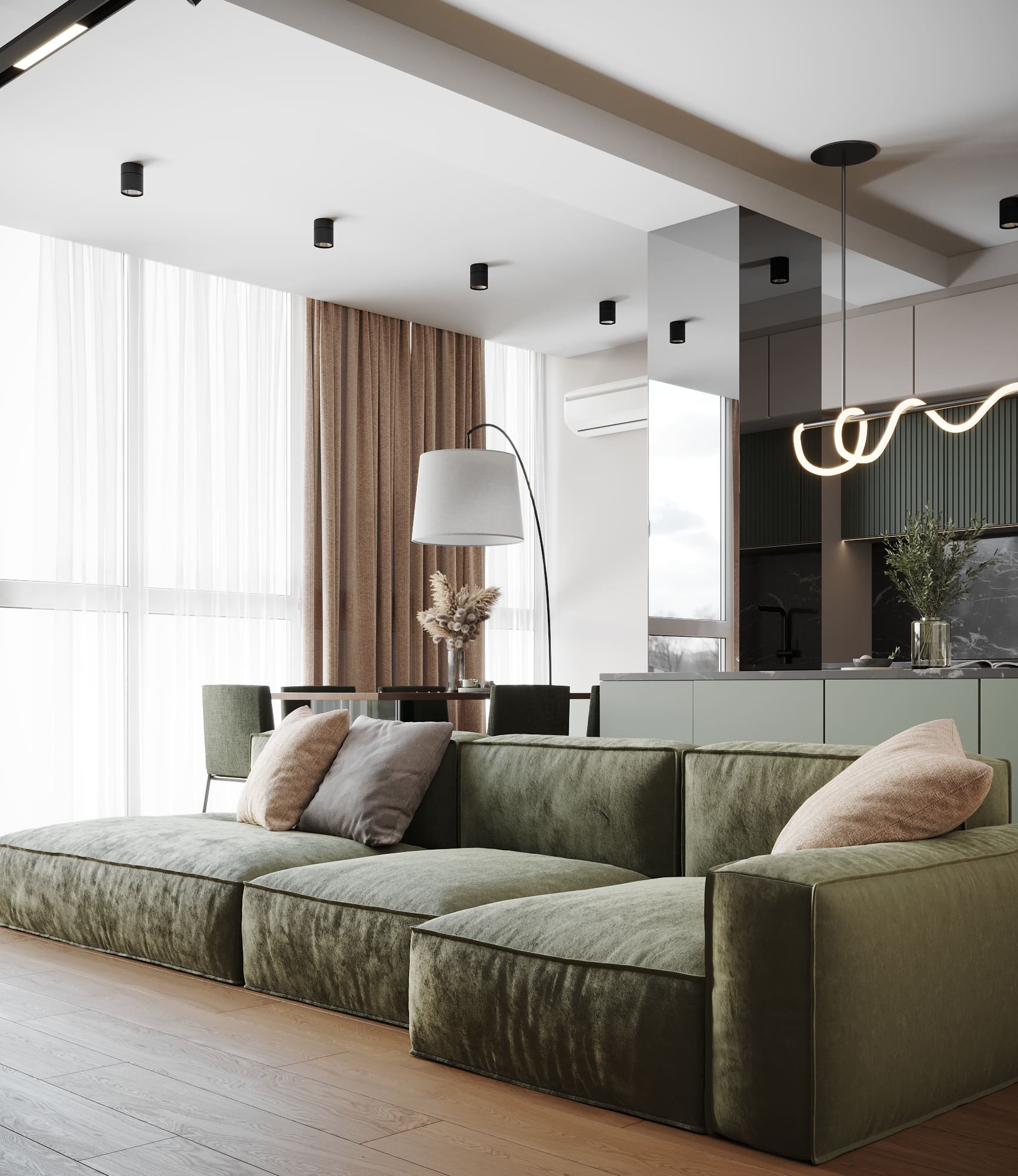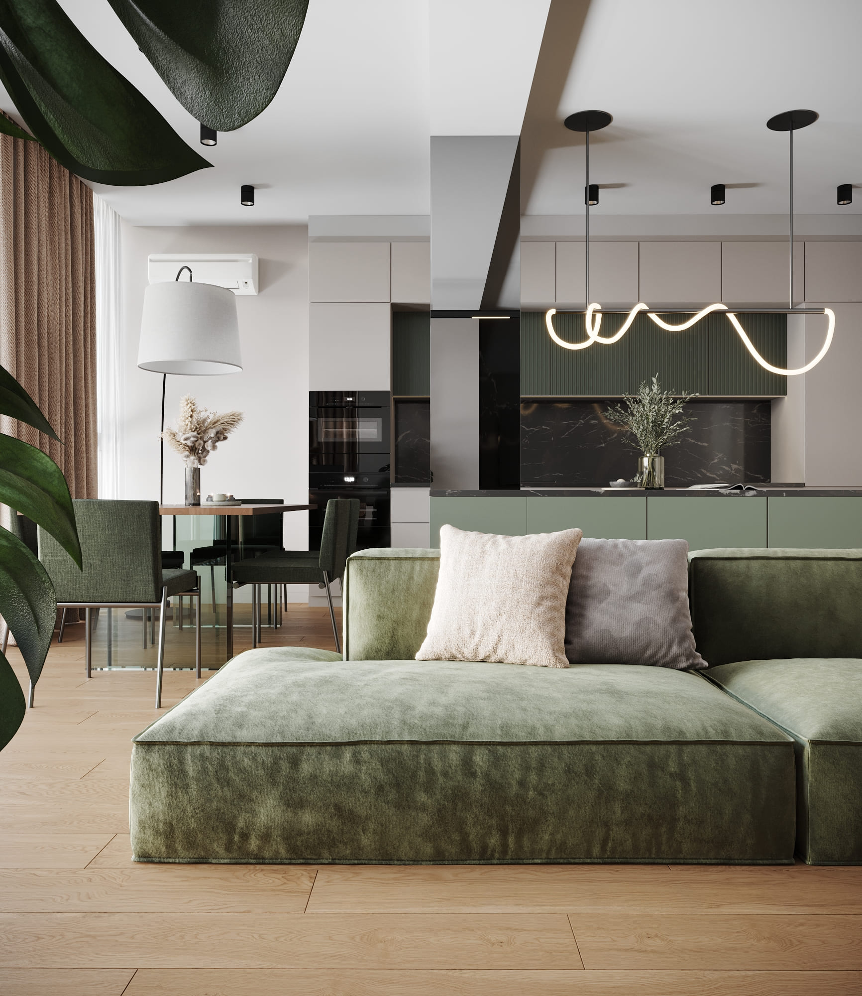 Главный акцентный цвет квартиры был выбран на основе любимого комнатного цветка нашего заказчика –– монстеры.