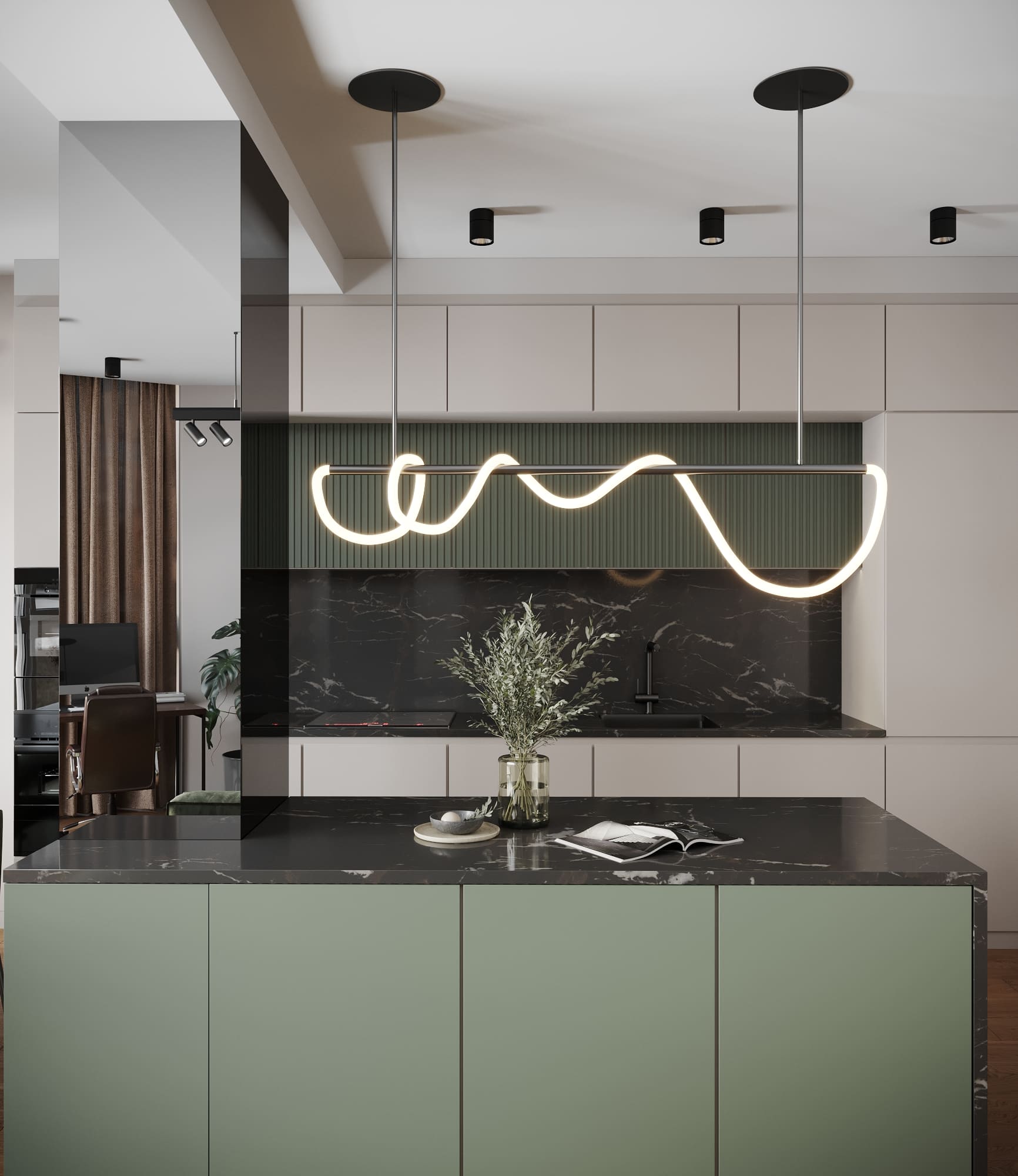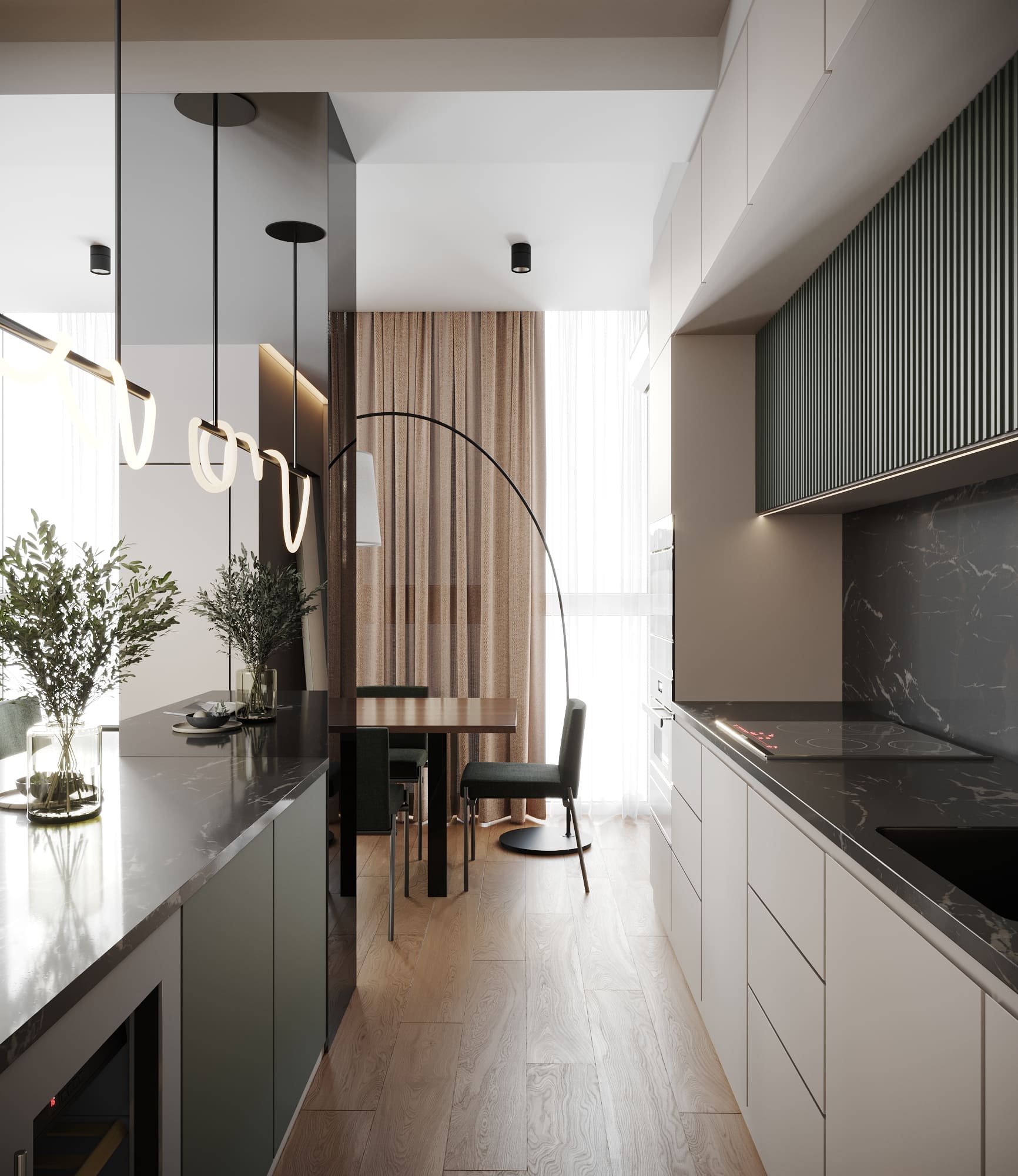 Для ценителей личного пространства, где преобладает абсолютная функциональность и полный комфорт. Мы объединили черно-белую цветную гамму с деревом и элементами зеленого. По просьбе клиента создан стильный и одновременно уютный интерьер.