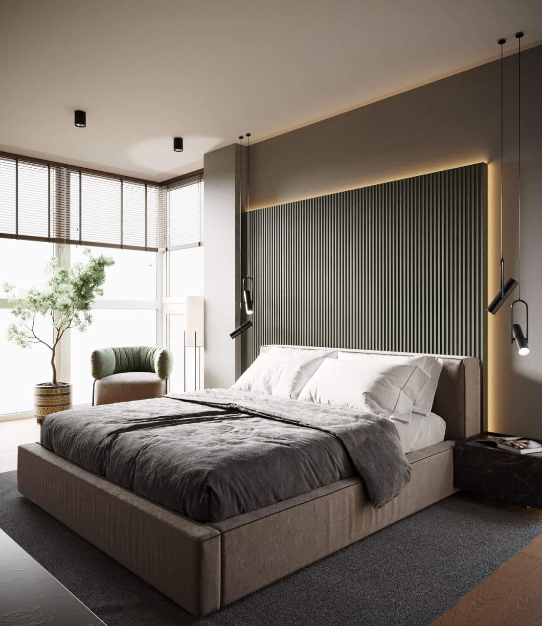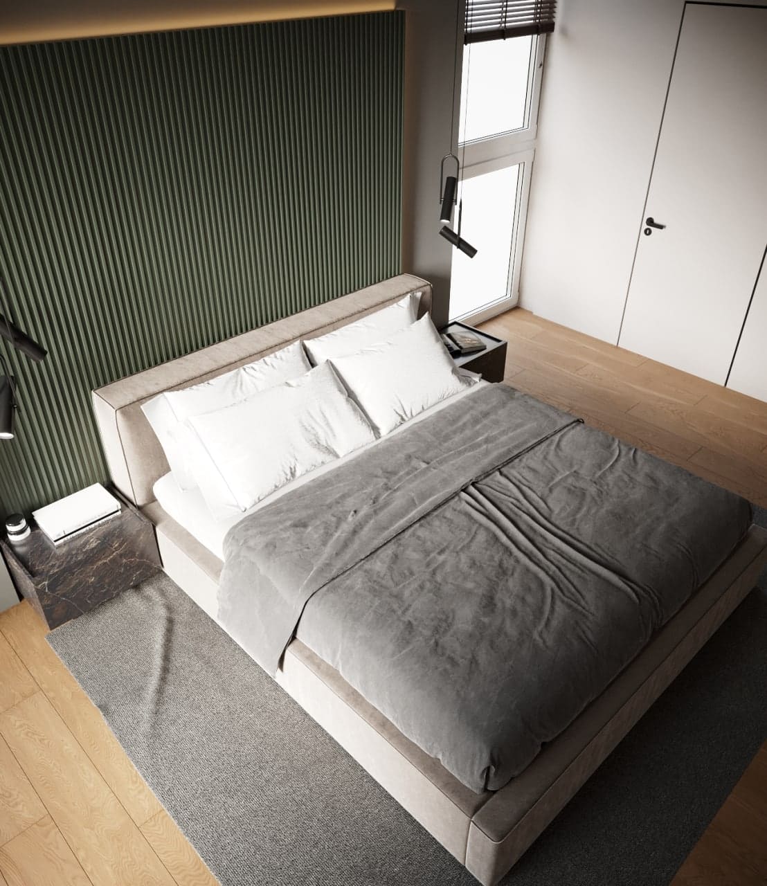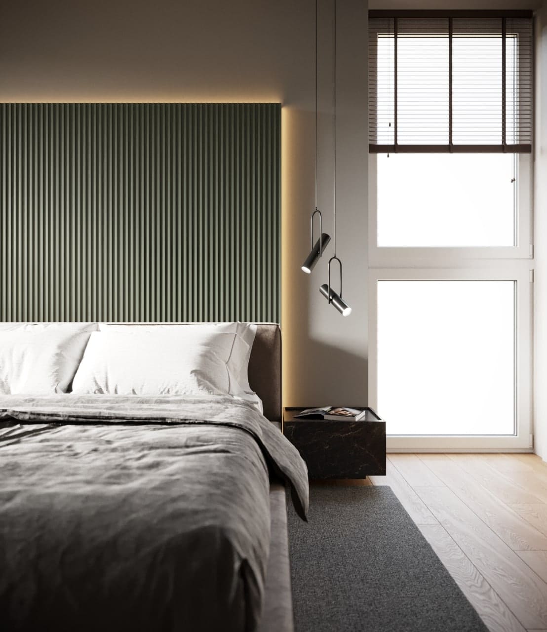 Спальня создана за идеей асимметрии композиции за счет стеновых реек. Теплые, спокойные тона, большая кровать и мягкое освещение выбраны для максимального релакса. Вместо штор мы использовали современные жалюзі. Среди прочего –– туалетный столик и место для чтения. Абсолютный комфорт и только самые необходимые вещи.