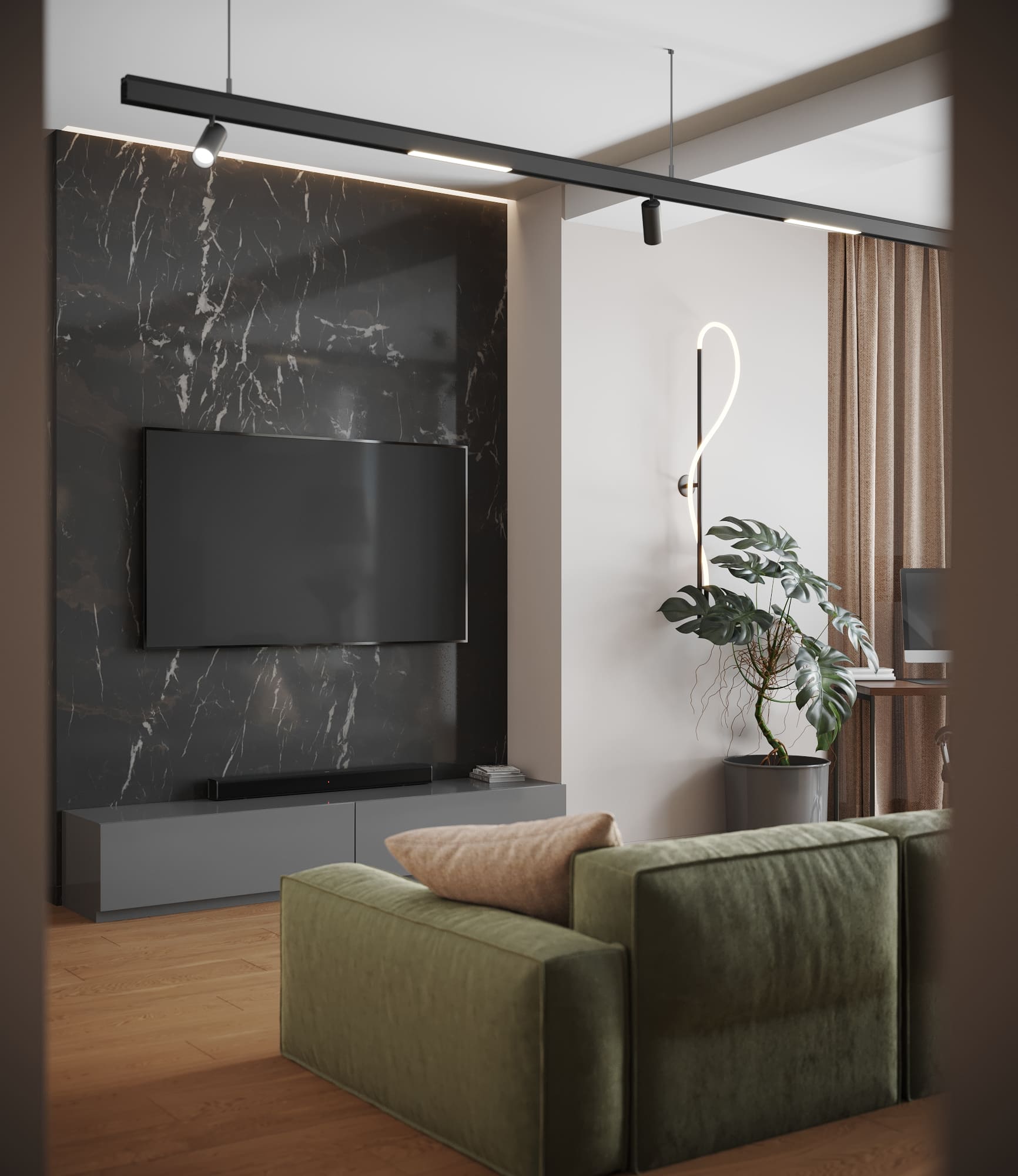 Важным акцентным элементом является панель за телевизором, которая выполнена из черного камня.