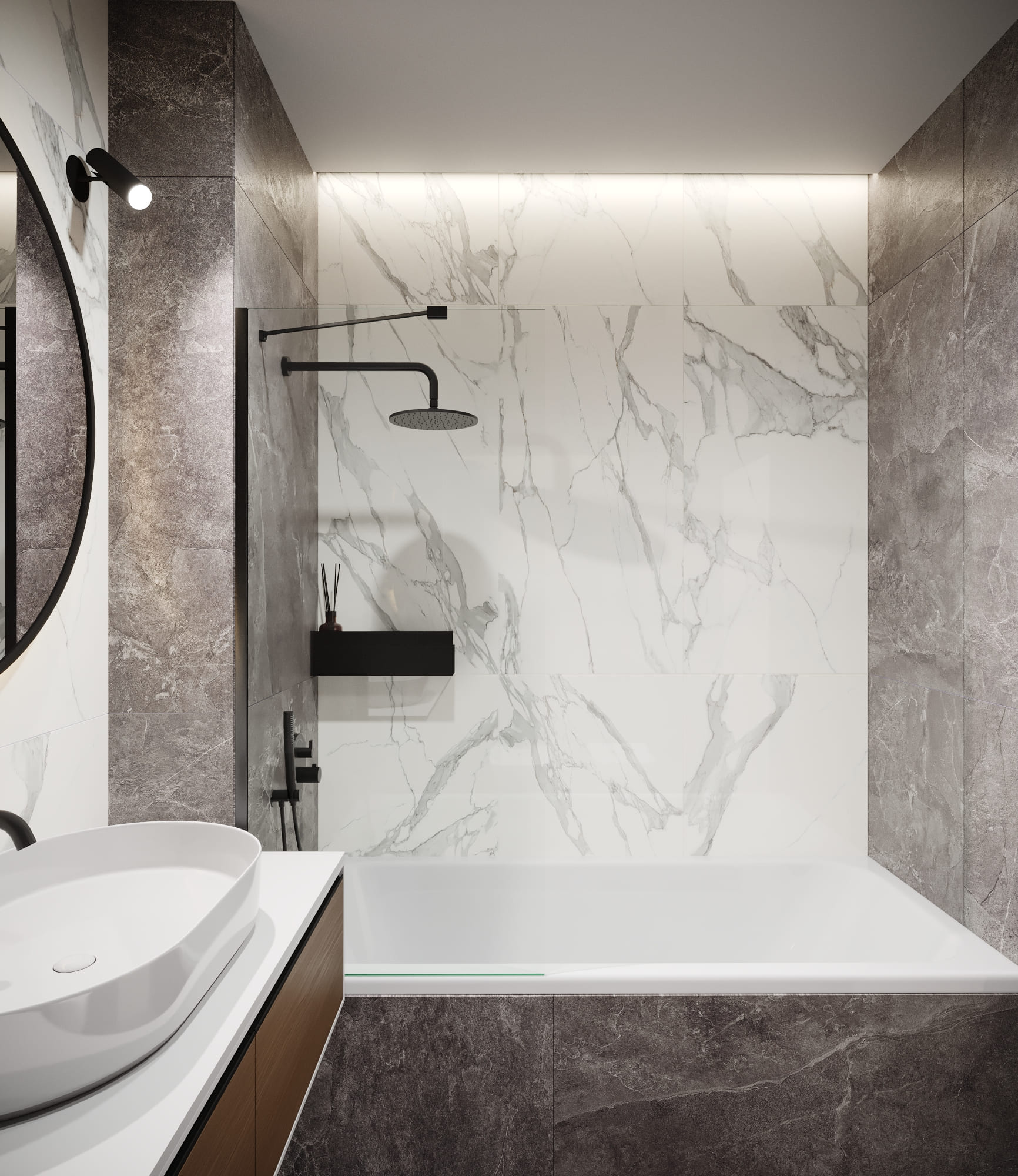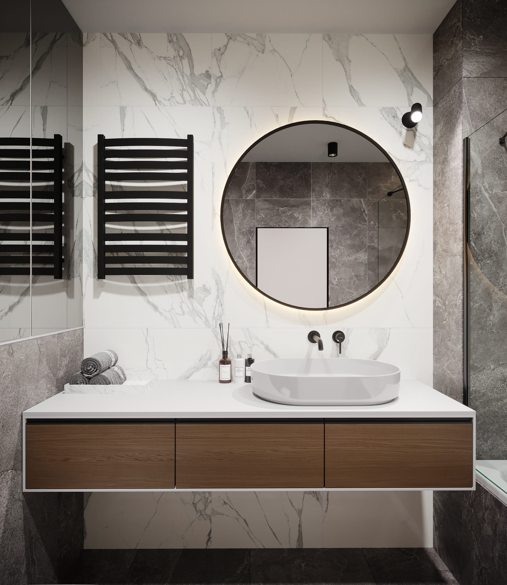 Санузел выполнен в черно-белой цветовой гамме с контрастными элементами. Напротив входа находится раковина, справа –– ванна, слева –– биде и унитаз. Также над унитазом находится зеркало а за ними скрытый шкаф. Именно за счёт зеркал увеличивается пространство, а эмбиент-подсветка создает камерный эффект.