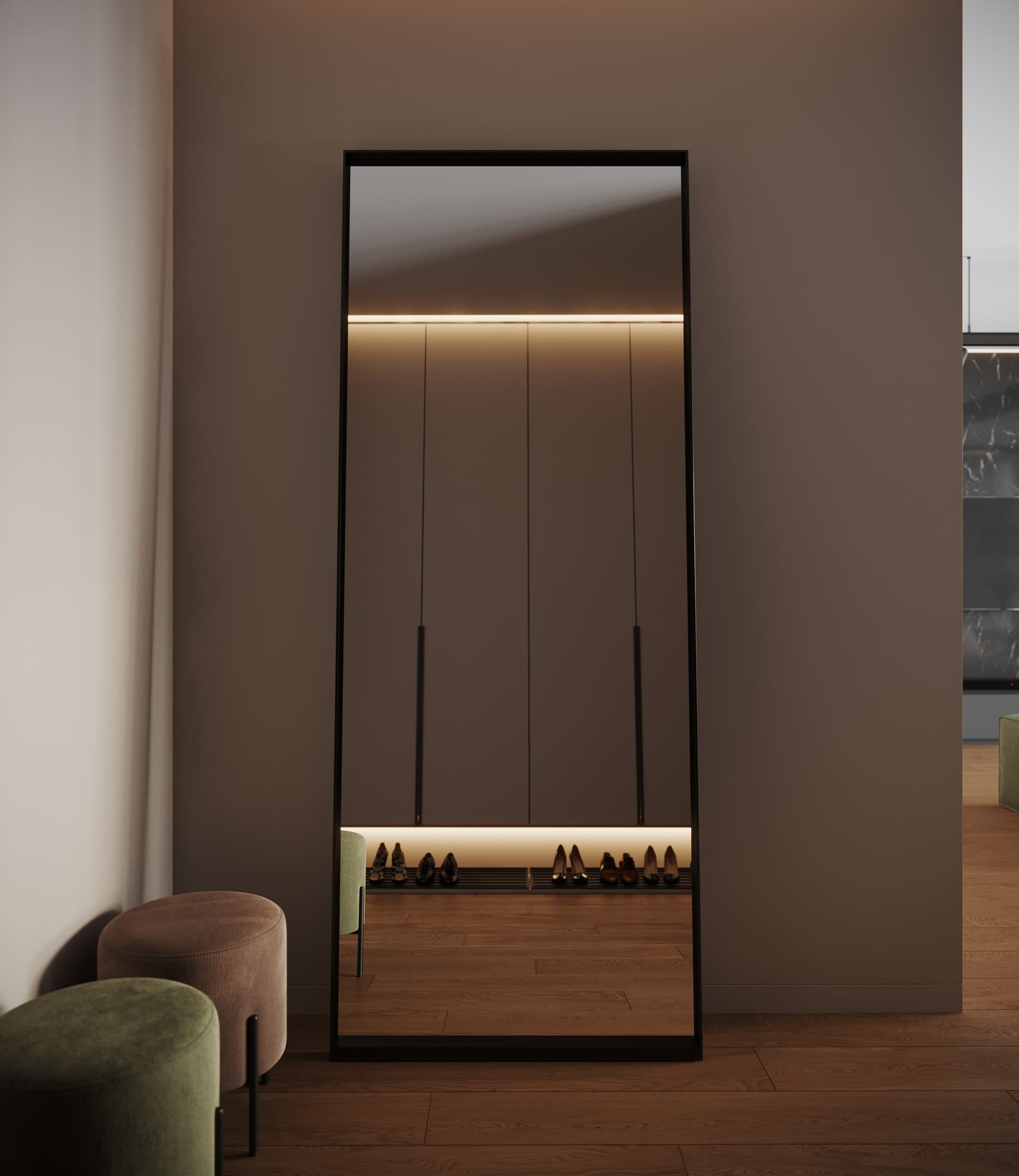 Цветовая гамма изображено с темно-зелеными контрастами, также добавлены акцентные черные линии. Отопление происходит за счет теплого пола. Материал полового покрытия –– кварцвинил. Для освещения использованы подвесные трековые светильники. Выдержанная прихожая с пуфами и зеркалам, то есть, ничего лишнего.