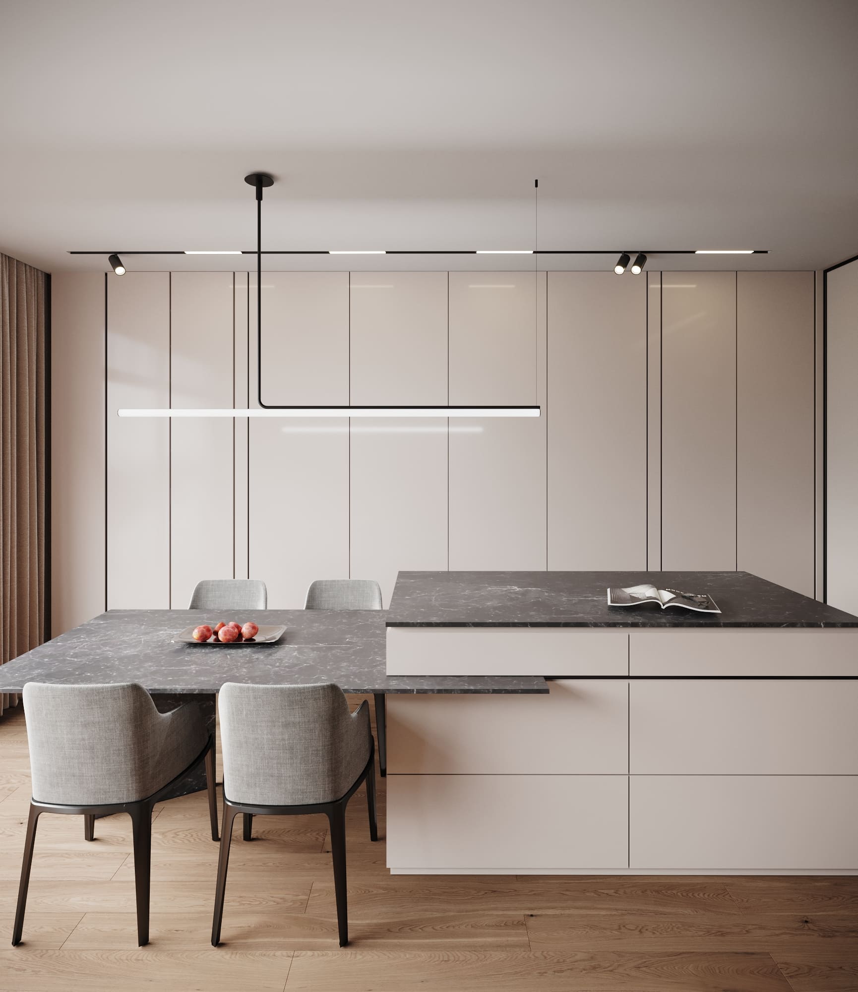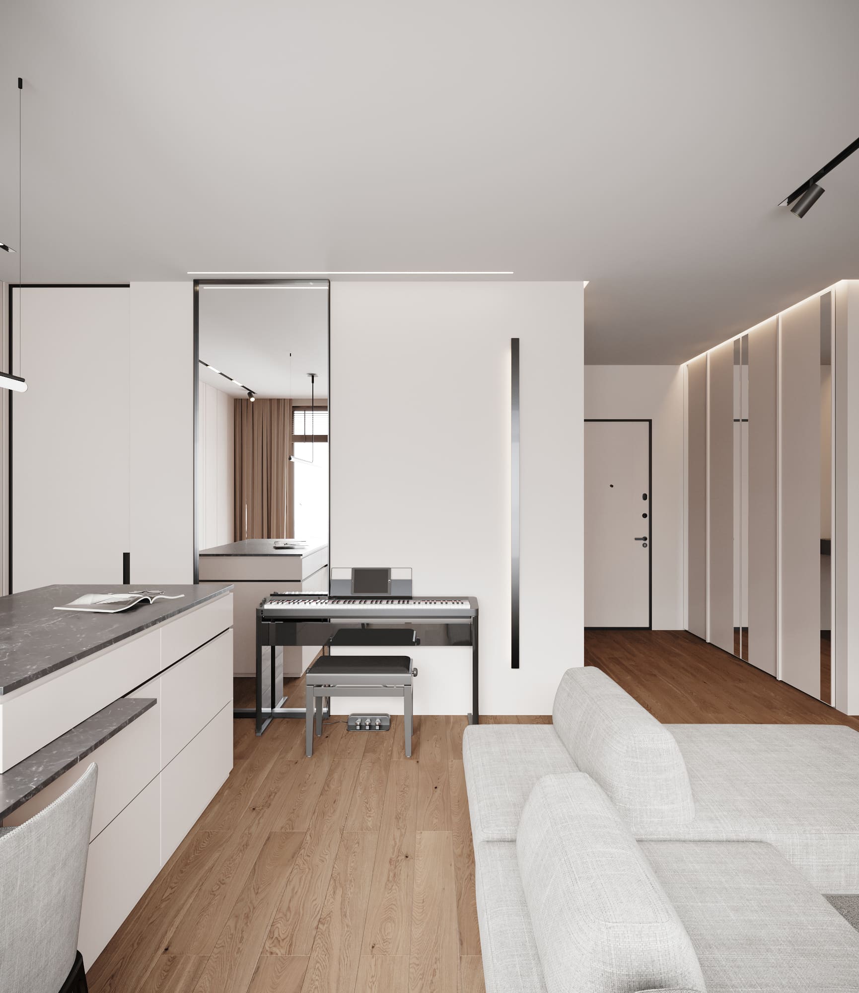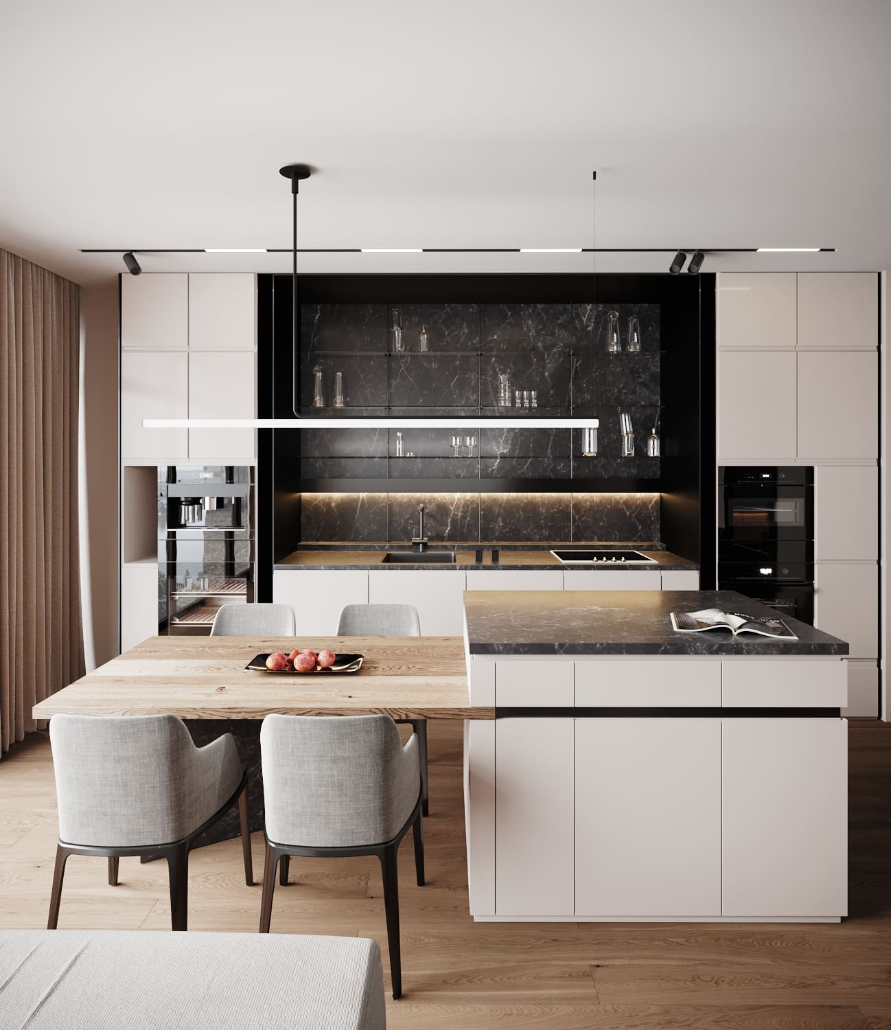 Преследуя идею чистоты и минималистичности, рабочая поверхность кухни находится за фасадами, что является оптимальным решением. Для дополнительного пространства также предусмотрен чулан для хранения бытовых вещей. Все проникнуто тонкими симметричными линиями, которые делят пространство на частички, словно объясняя –– все в этом мире имеет свое место.