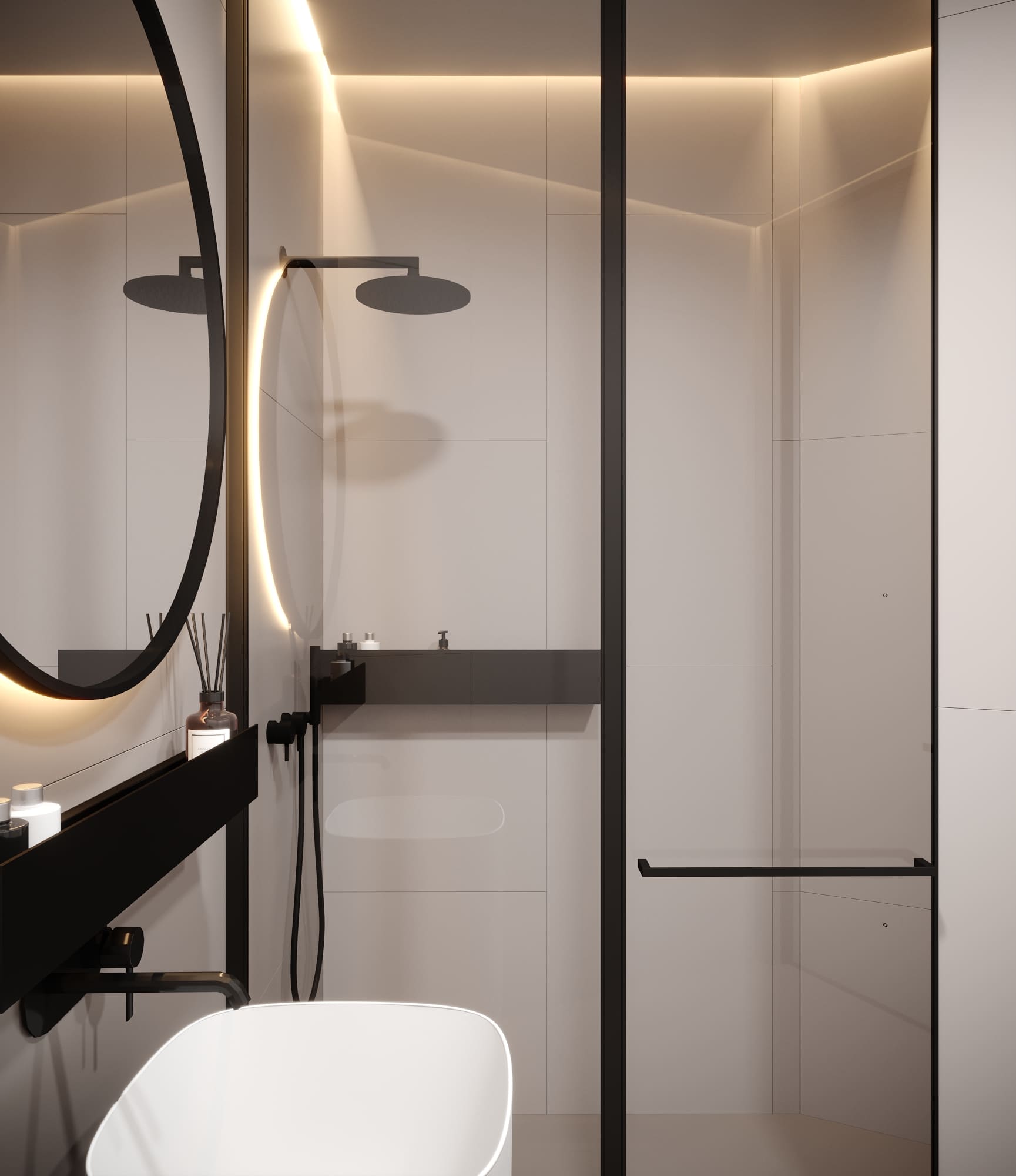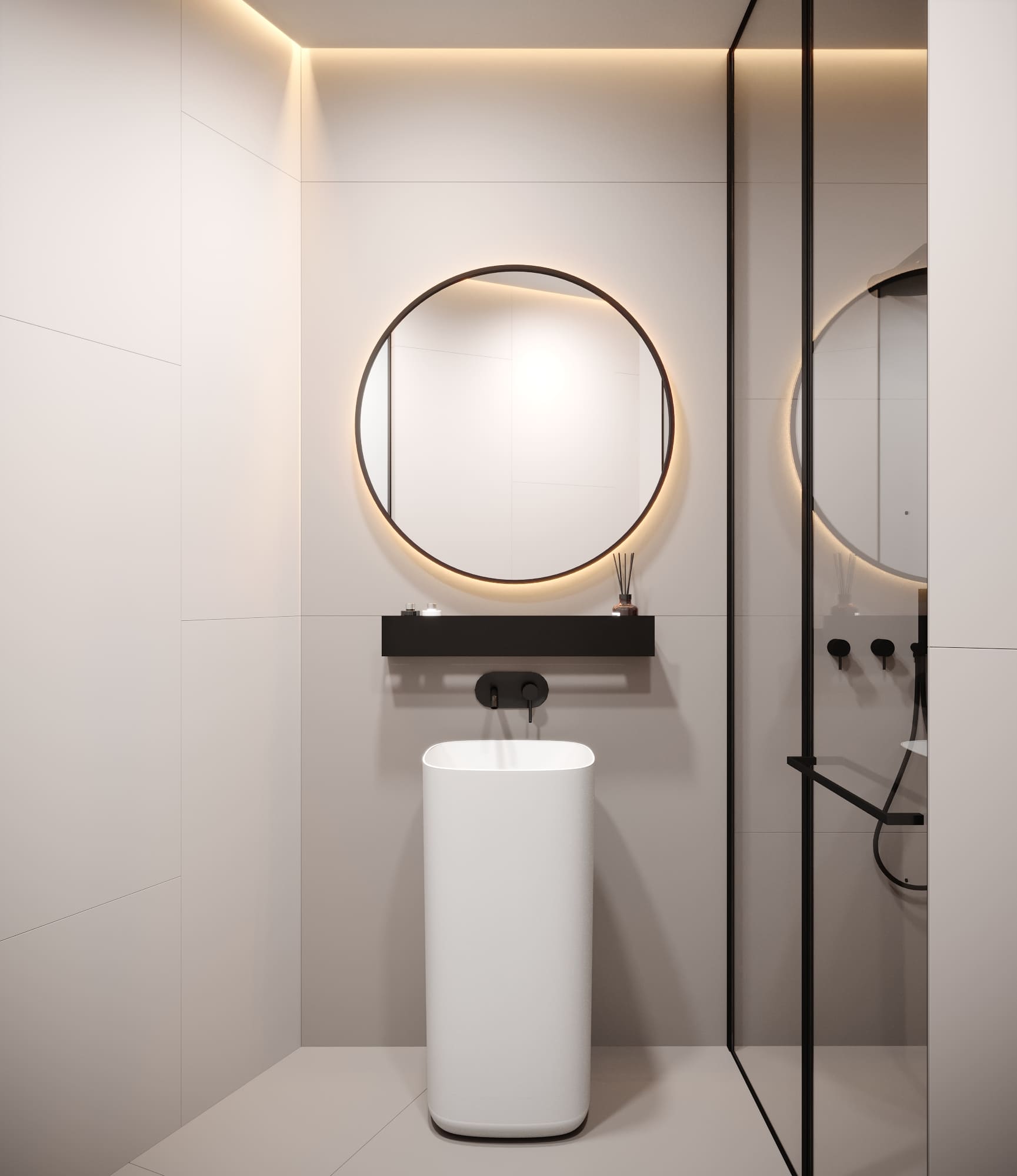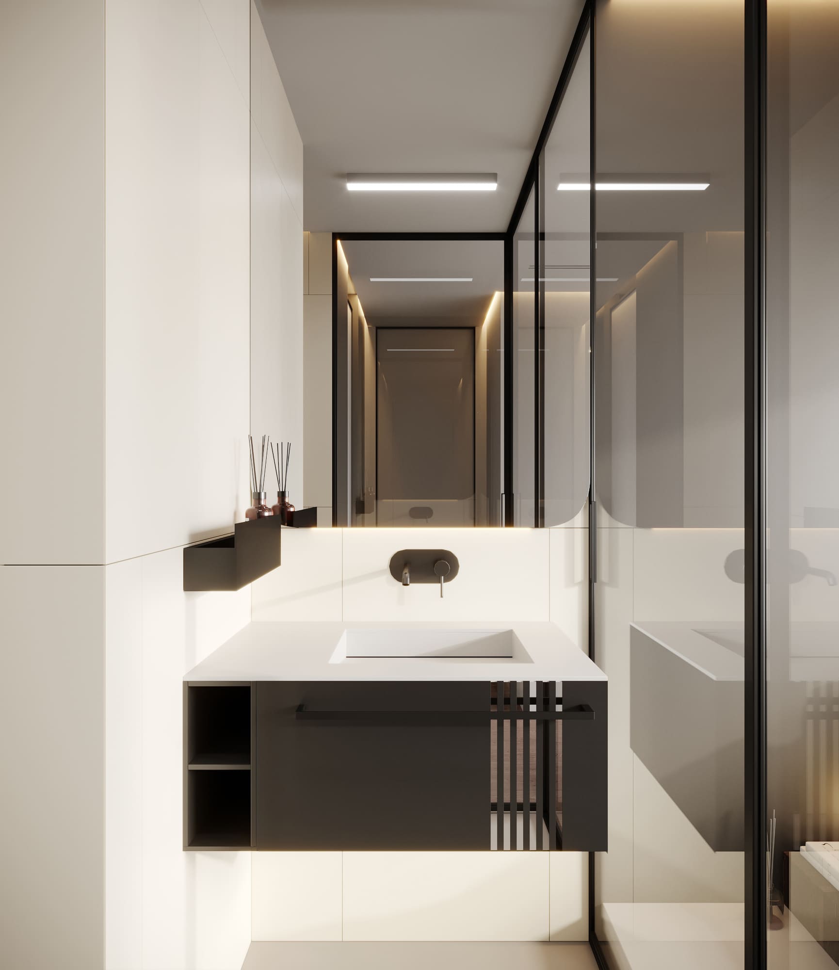 Простота и функциональность прослеживается и тут –– отдельностоящая раковина, скрытые смесители, душевая кабина без поддона, накладная черная полочка. Идея вставных черных элементов простилается и в этом помещении. Плитка со смещением, а для того же камерного эффекта выполнена подстветка.