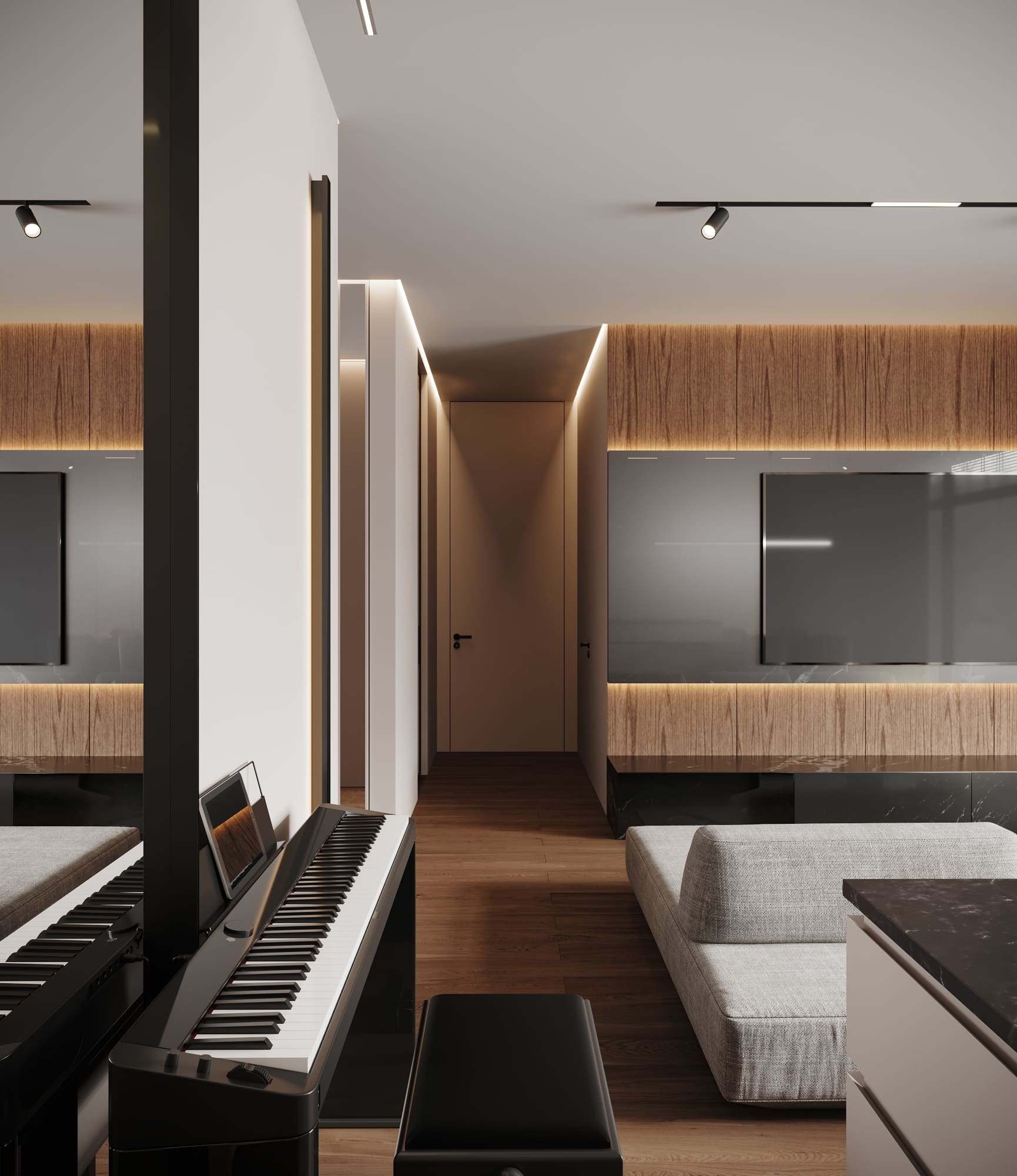 Свет, тепло, тонкие черные линии, которіё придают комнате акцента. Насчет комфорта –– отопление происходит за счет теплого пола. Насчет удобства –– наличие дверей скрытого монтажа.