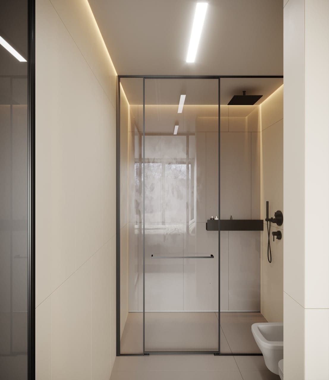 Через спальню хозяев имеем выход к санузлу. Благодаря стеклянной матовой перегородке получаем достаточно света и приватности. В самой ванной нас встречает симметрия и контрастность, созданная благодаря черным элементам. Напротив входа –– раковина, потом унитаз, биде и тропический душ в конце. Душевая кабина без подиума, смесители скрытого монтажа. Максимальное использование пространства, наполнение функциональность и простотой. Плитка с замещением, а амбиент подсветки создает атмосферный камерный эффект.
