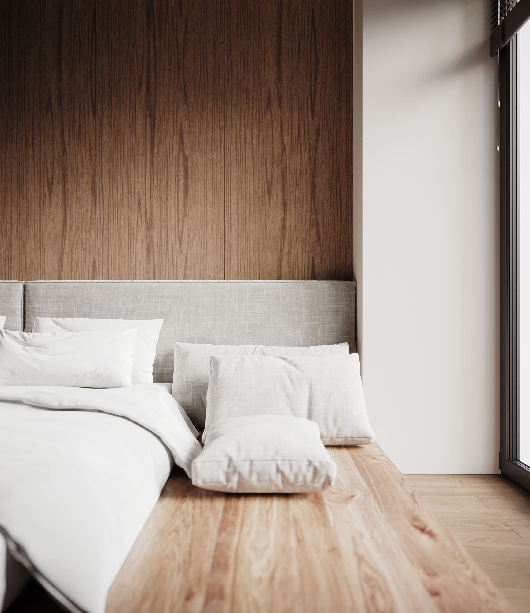 Композиция создана асимметрично – тумба, место для чтения, а между ними большая консольная кровать. Шароподобный светильник и встроенные треки дают достаточное освещение, а цветовая гамма тёплого дерева –– отдых и гармонию.