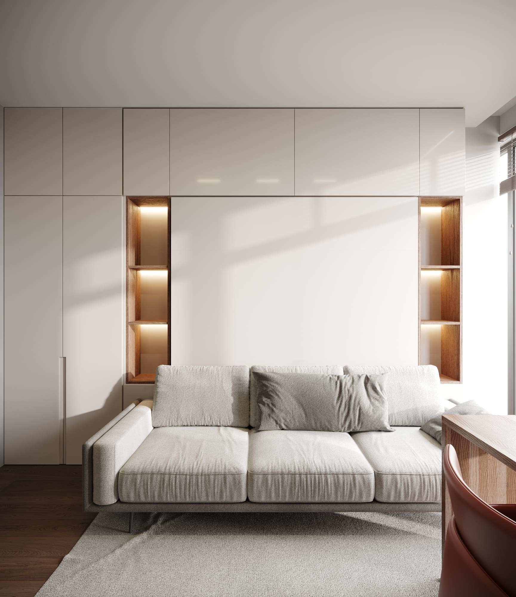 То есть, работать это будет следующим образом –– имеется кабинет с консольной тумбой со столом, где хозяин может уединиться и заняться работой или творчеством. Максимально свободное личное пространство, которое так нужно каждому. Тем не менее, при необходимости есть возможность быстро превратить данный кабинет в гостевую комнату, сложив стол и превратив диван в комфортабельную кровать, матрас которого находится за фасадом. Готовность принимать гостей: 11/10.