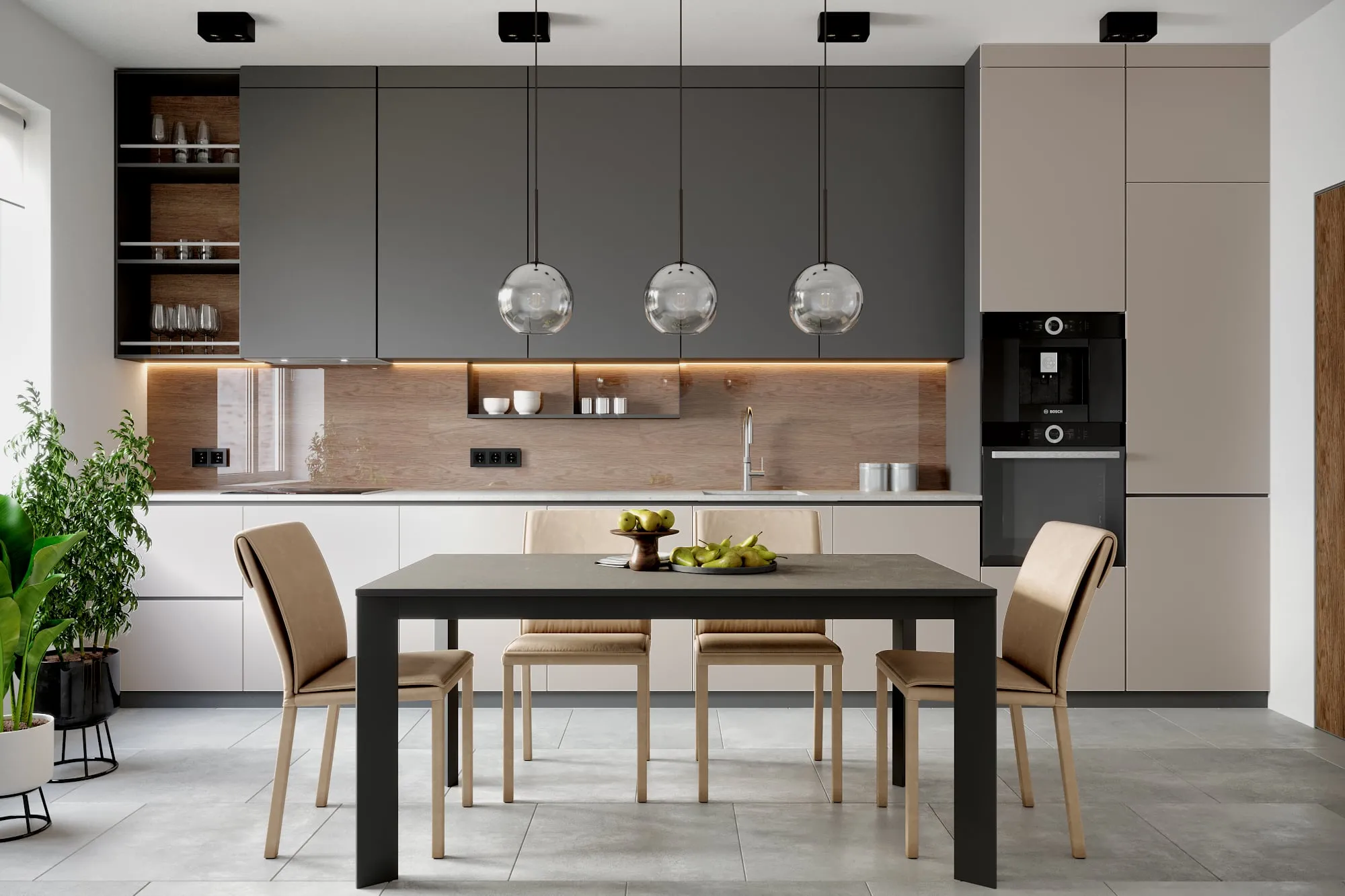 В кухне удачно объединены глянцевый фартук под дерево, пастельные фасады и серый пол. Есть большой обеденный стол от украинского производителя и комплект удобных стульев. Акцентом кухни стали хромированные подвесы над обеденной зоной.