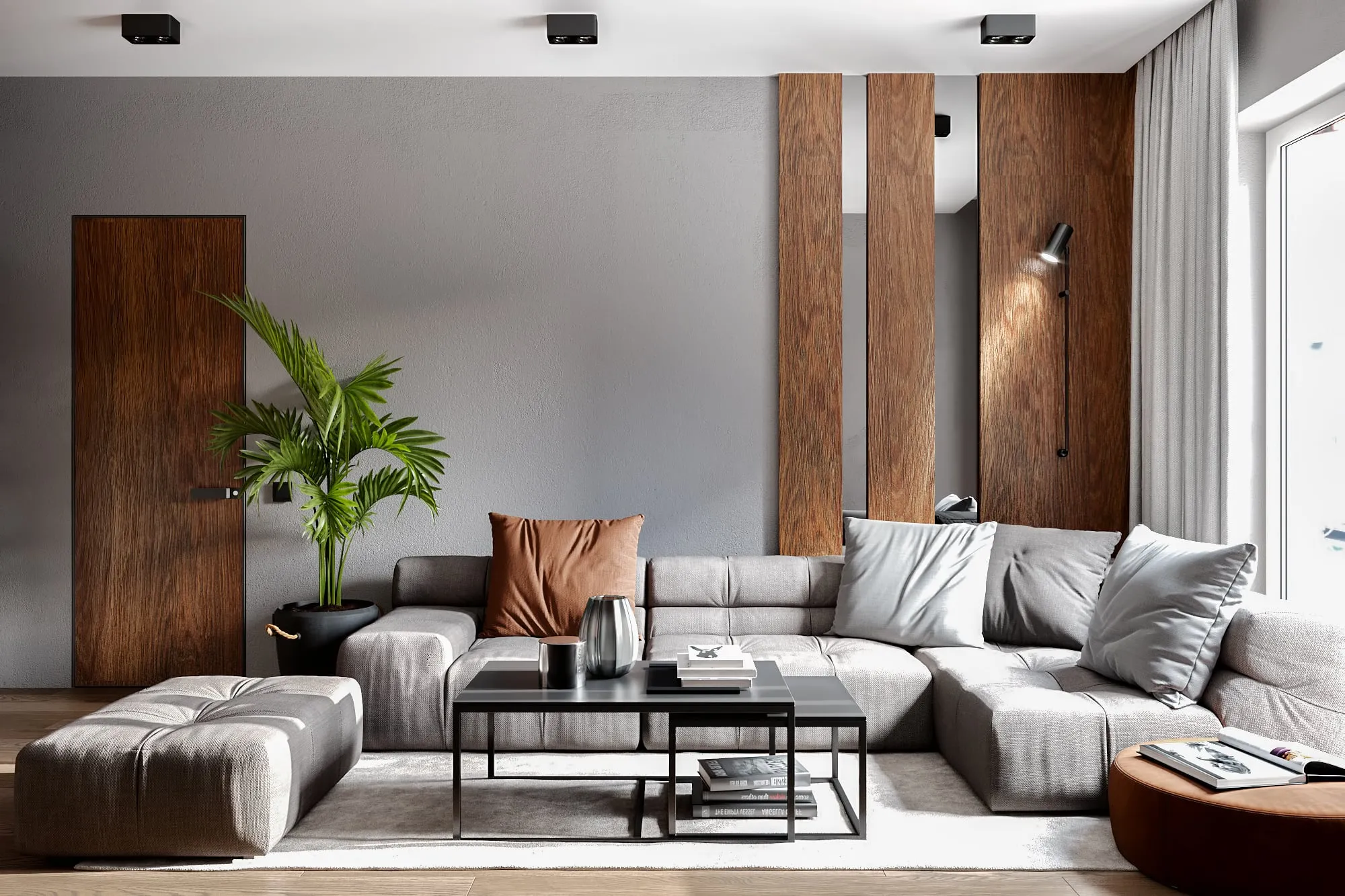 В стиле Fusion предусмотрено межкомнатные двери из шпона дерева. Контрастный акцент – чёрные ручки.