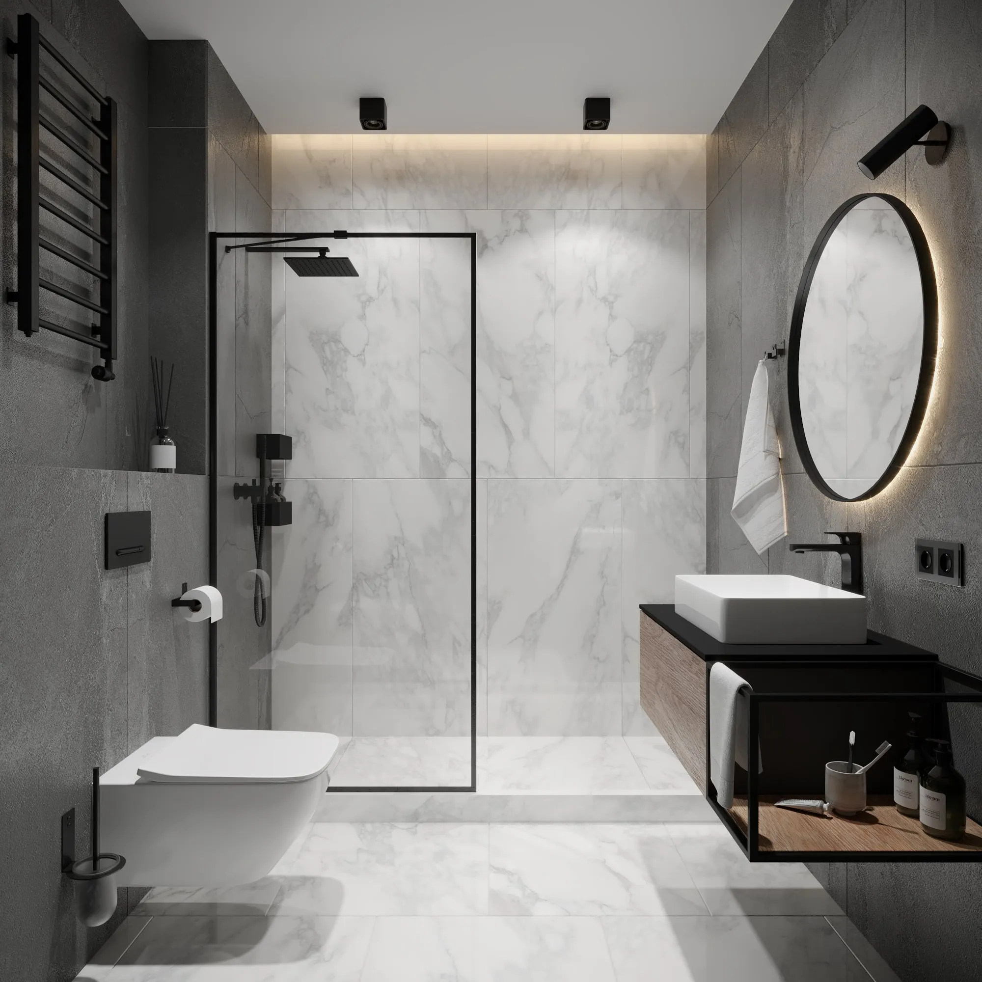 Ванная комната в стиле Fusion – это сочетание глубокого серого цвета и глянцевой плитки под мрамор. Просторный душ, чёрная матовая сантехника Imprese, подвесной унитаз с инсталляцией.