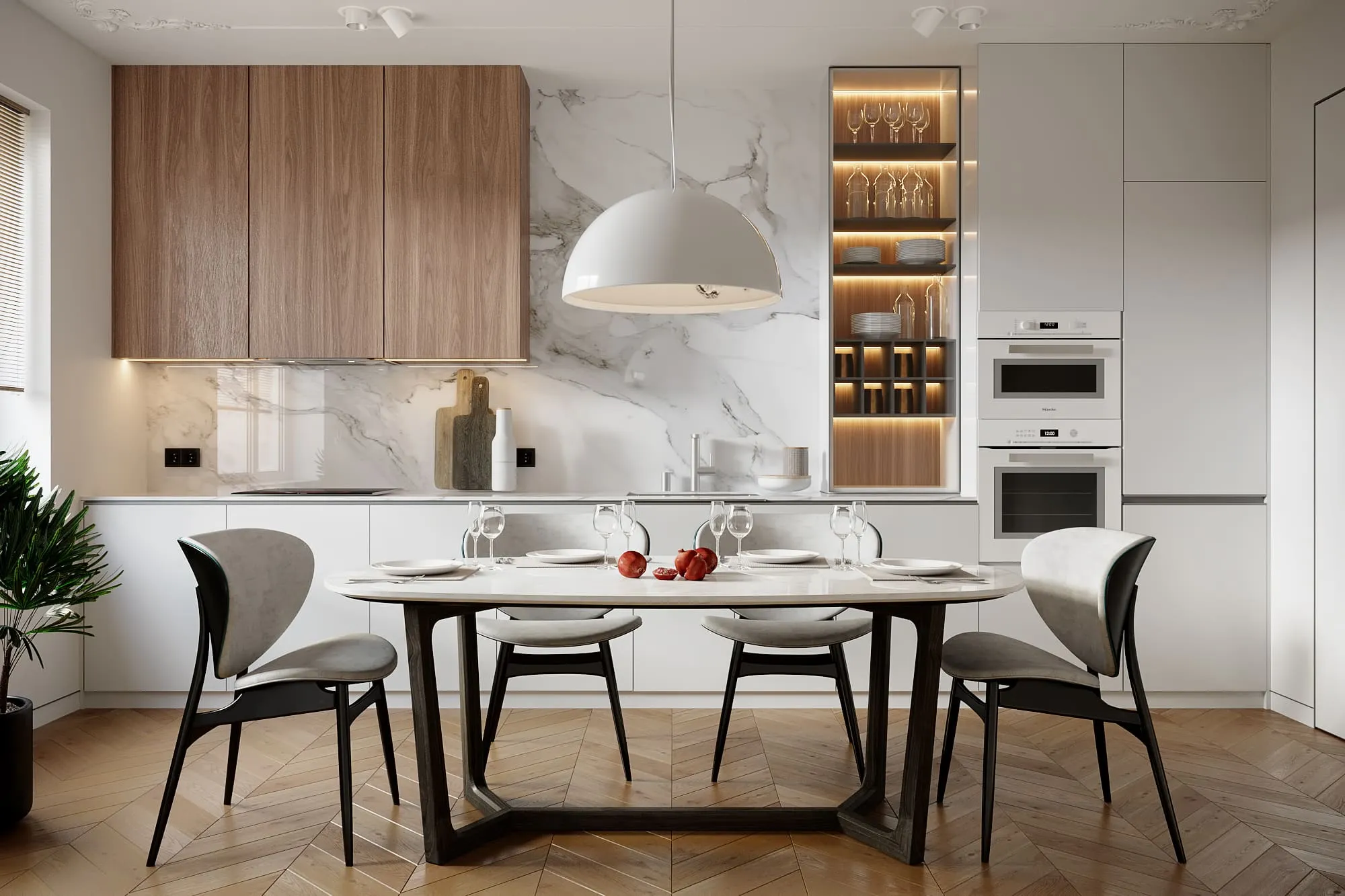 Кухня Neo Classic сдержана и в то же время элегантна. Натуральные оттенки дерева и мрамора удачно объединяются со спокойными серыми фасадами и белой столешницей. В середине кухни – массивный обеденный стол и комплект комфортных стульев, всё в чёрно-белых оттенках. Стол также глянцевый, сделанный под мрамор.