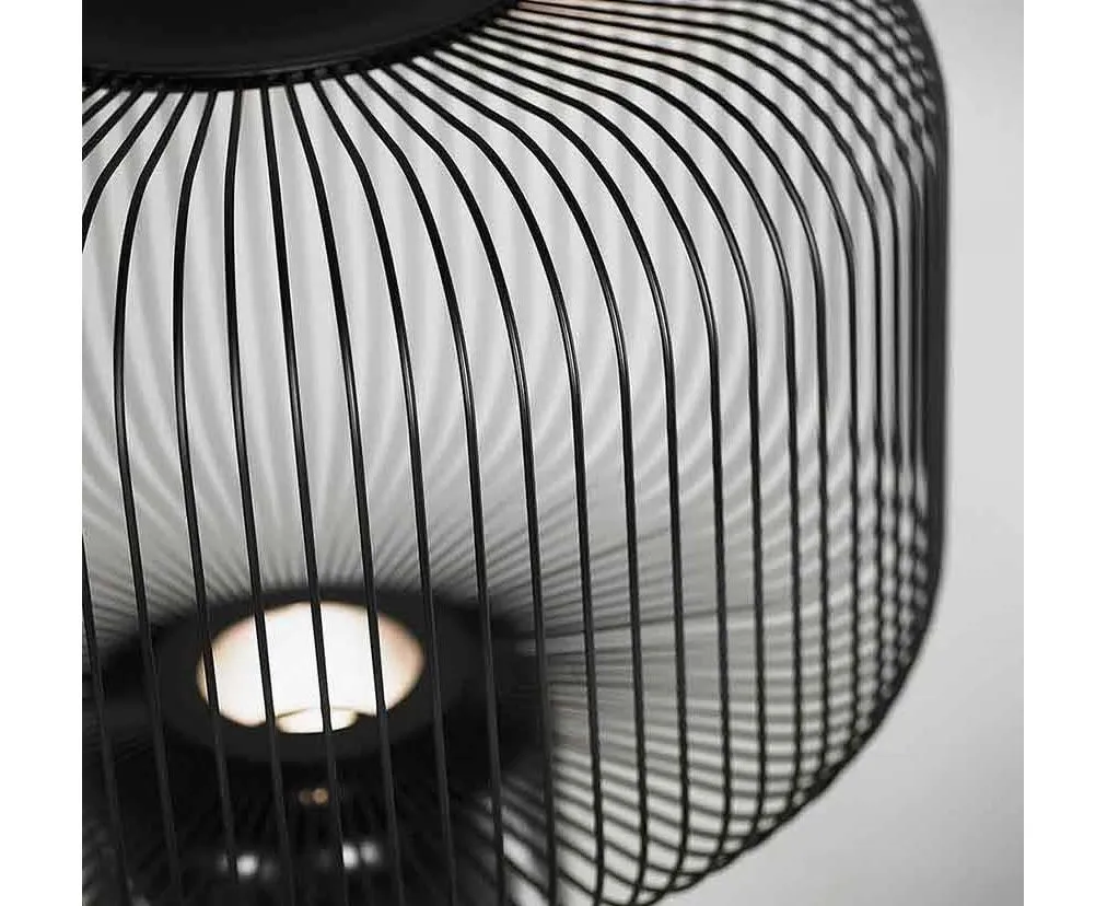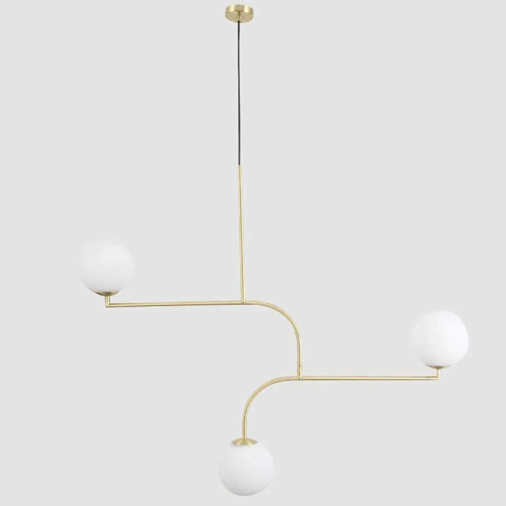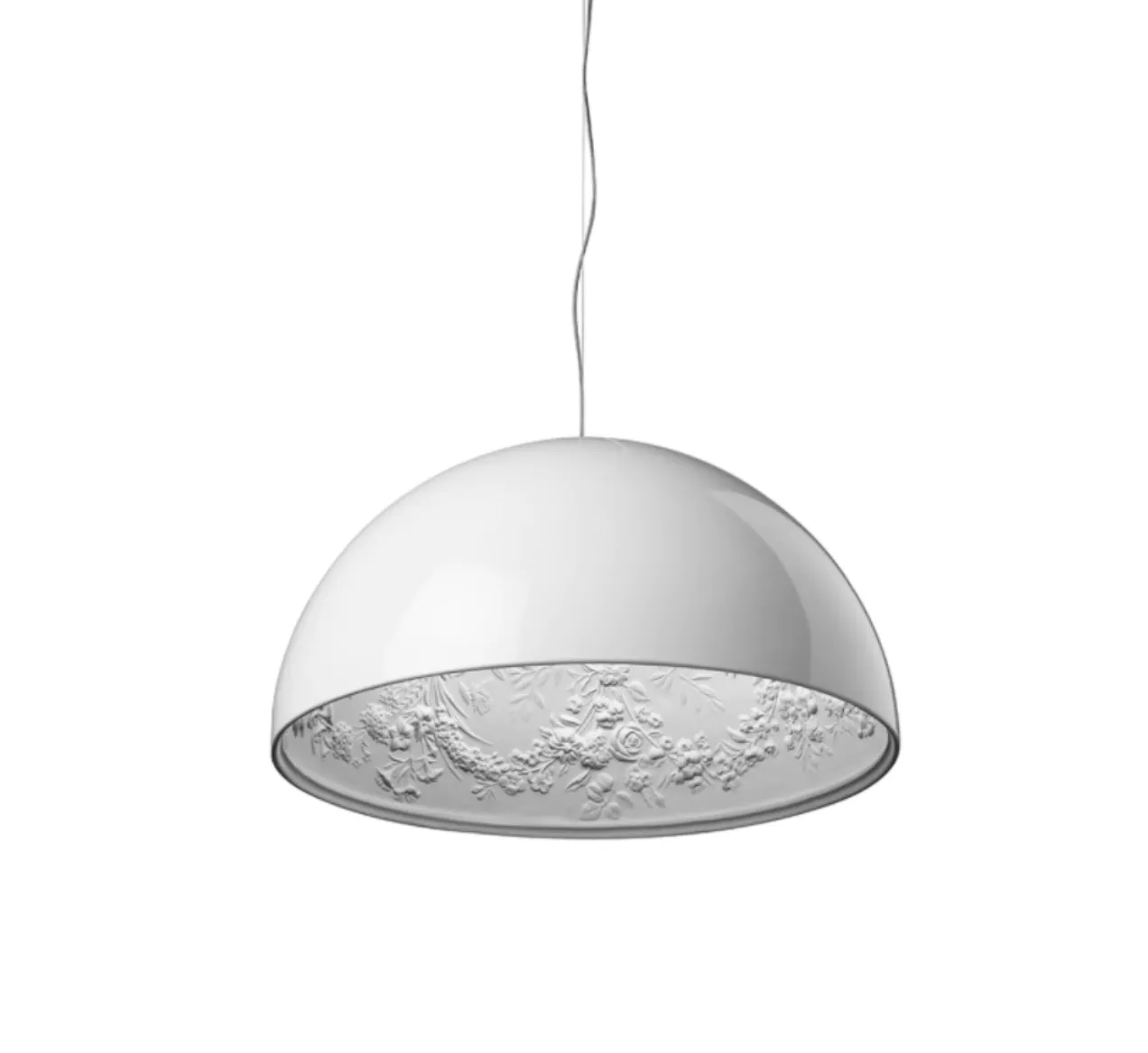 Над обеденной зоной – дизайнерская тросовая люстра с объёмной лепниной внутри.
