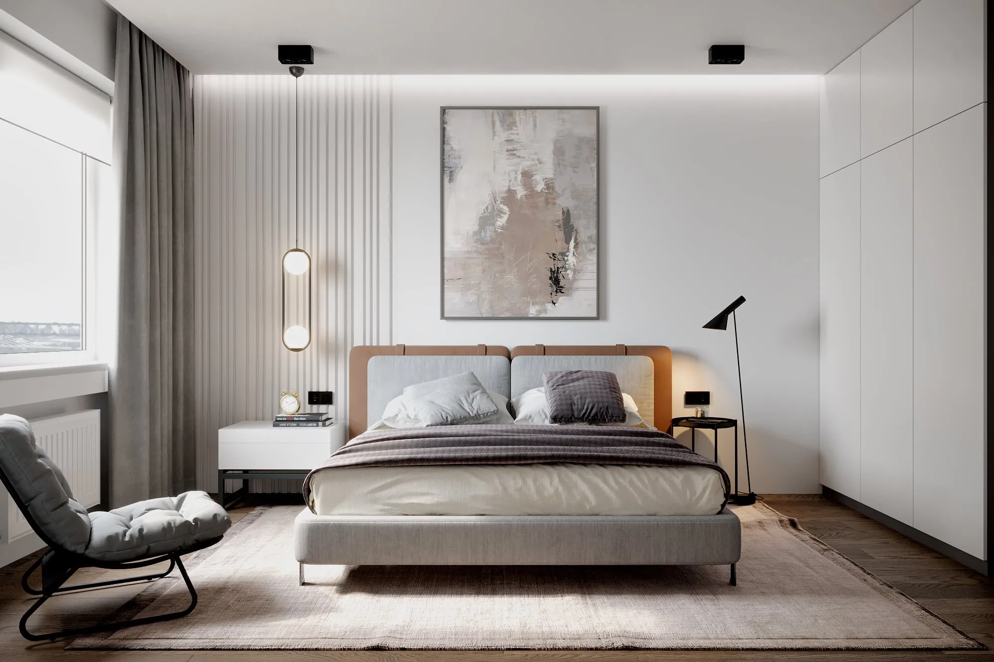 Спальню доповнюють приліжкова тумба, столики цікавих форм й лаунж-крісло.