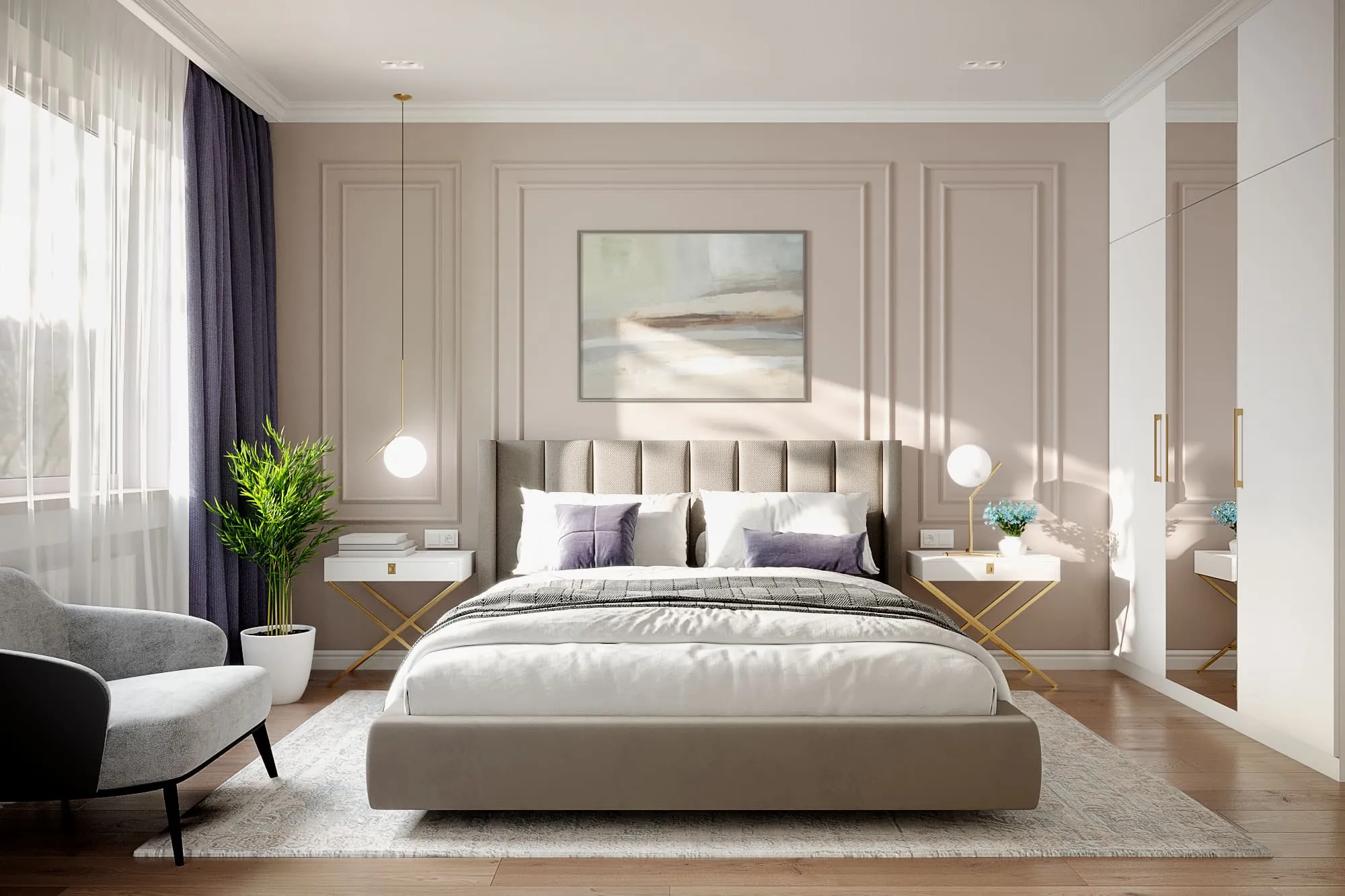 Спальню доповнюють парні приліжкові тумби та комфортне м’яке крісло від українського виробника.