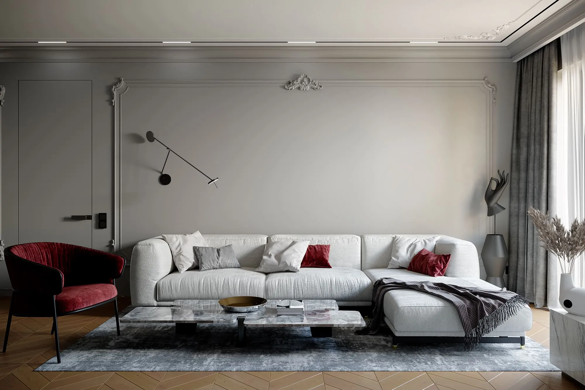 У стилі Neo Classic передбачено міжкімнатні двері прихованого монтажу. А завдяки тому, що двері пофарбовано в тон стін, вони стають майже непомітними. Єдиний акцент — матові чорні ручки.